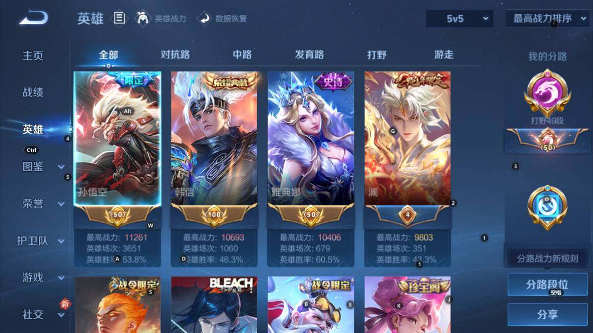 万战猴子韩信雅典娜,3个金标,打野49段,发育29段,对抗28段,3星传说,7