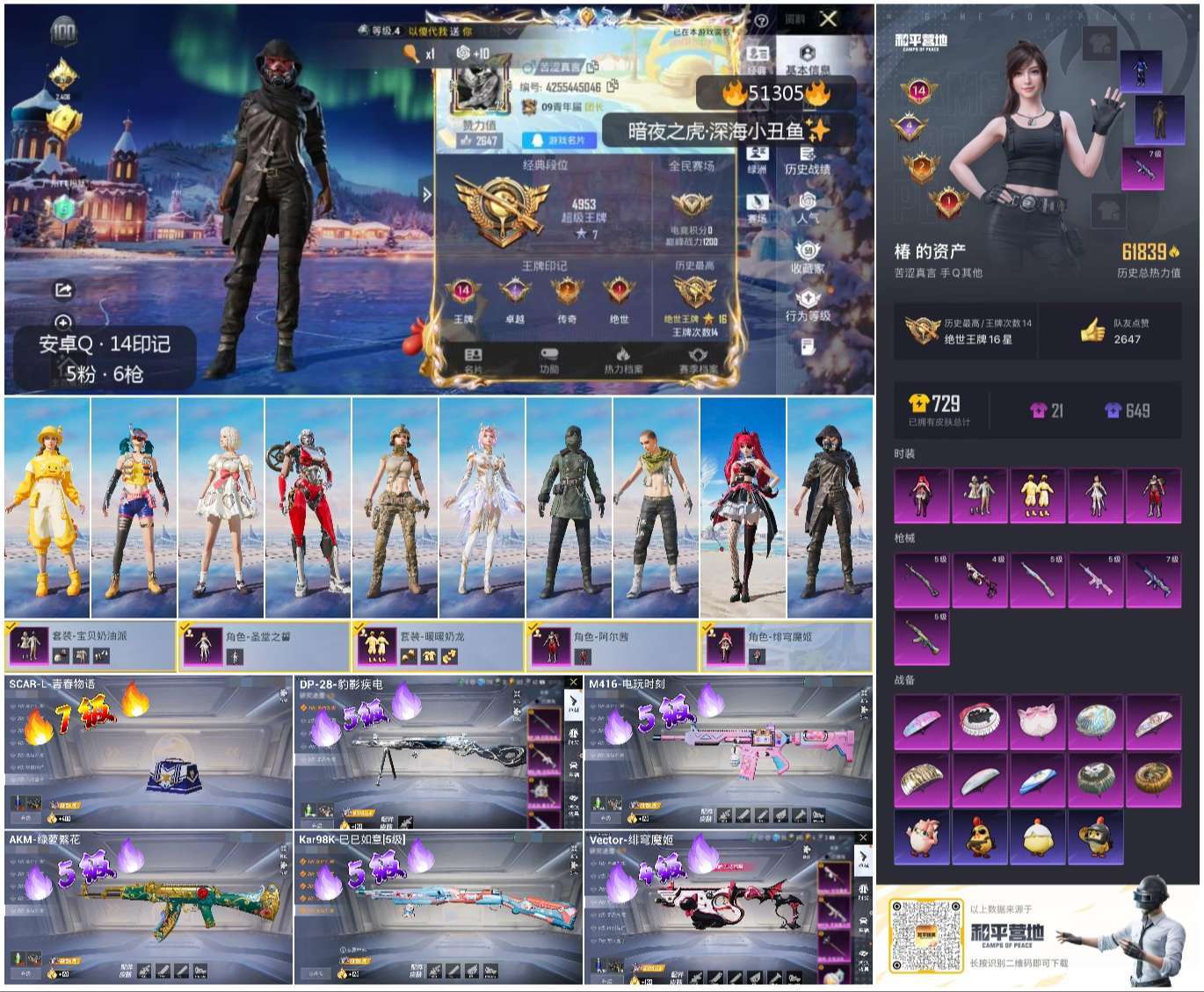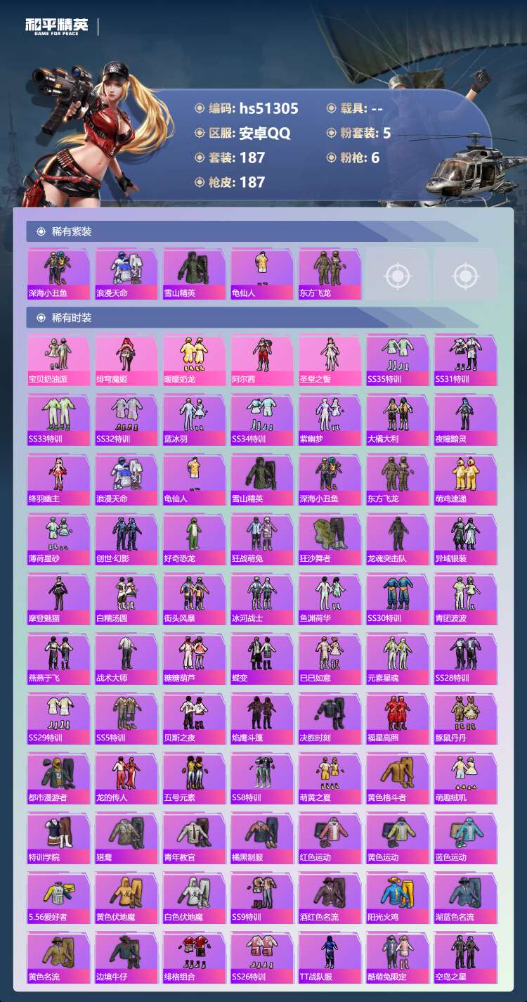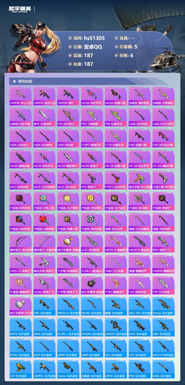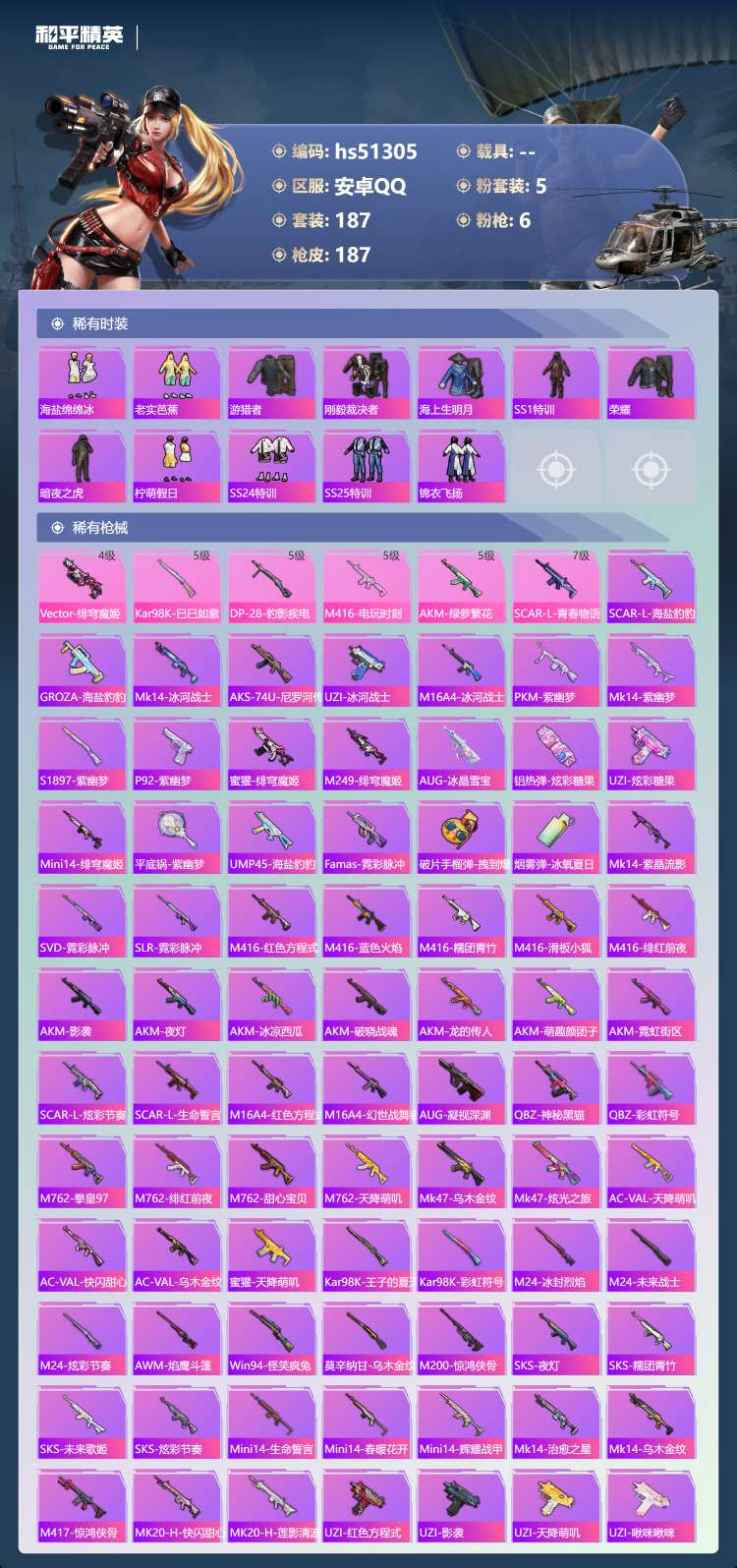 hs51305 安卓手Q-14王牌印记-5粉装-6特效枪-62035热力值-187套装-187枪皮-