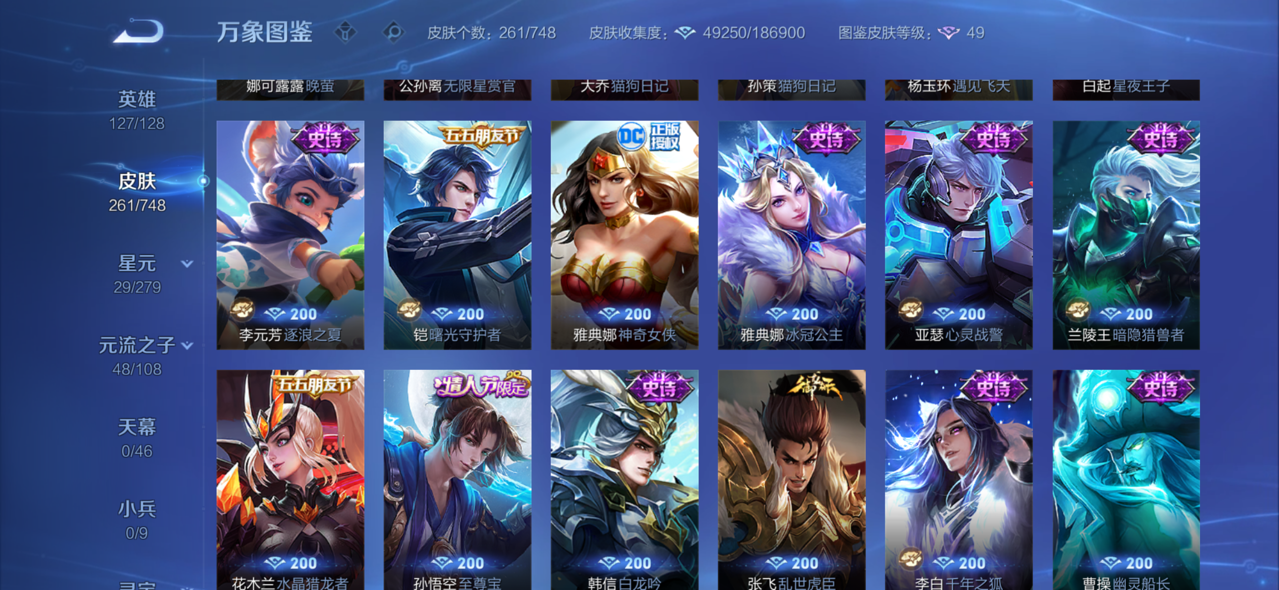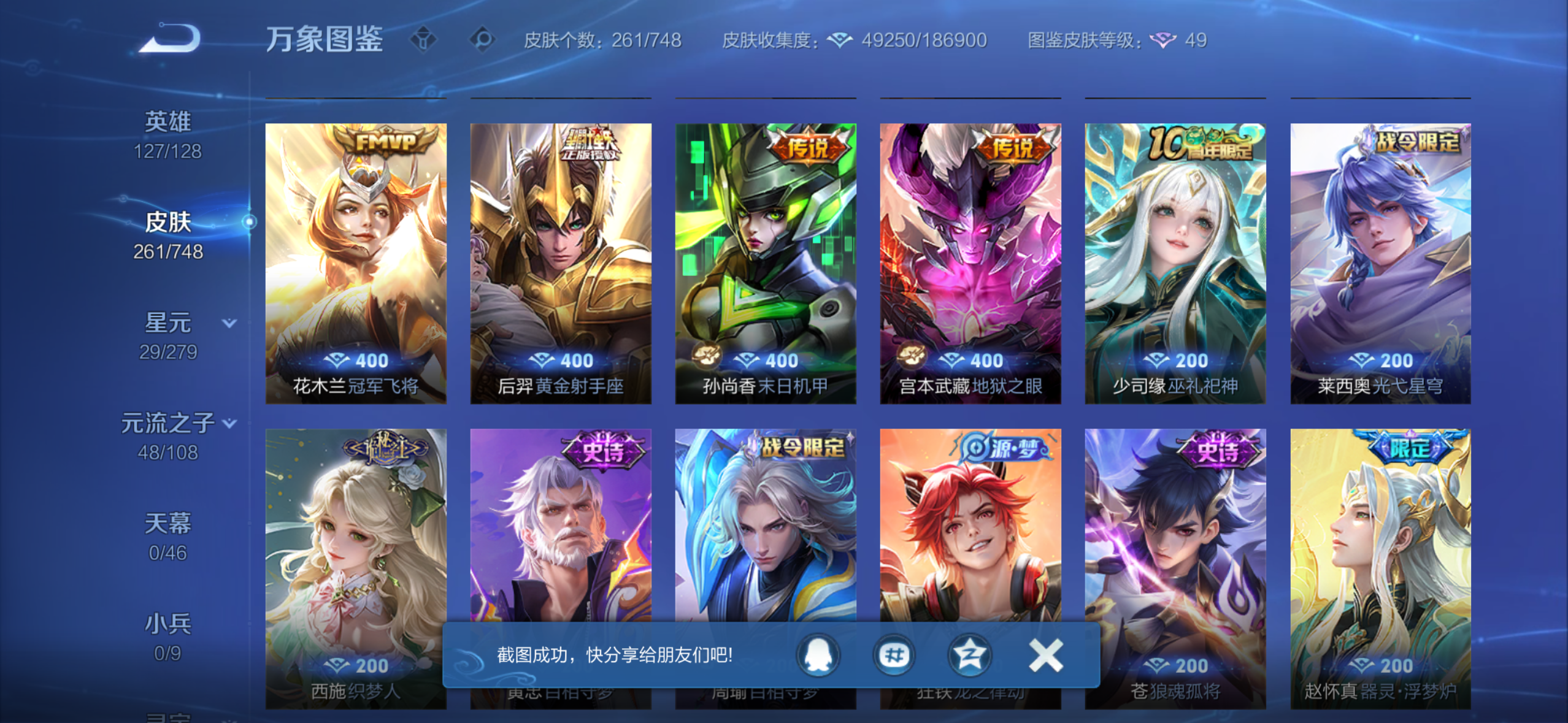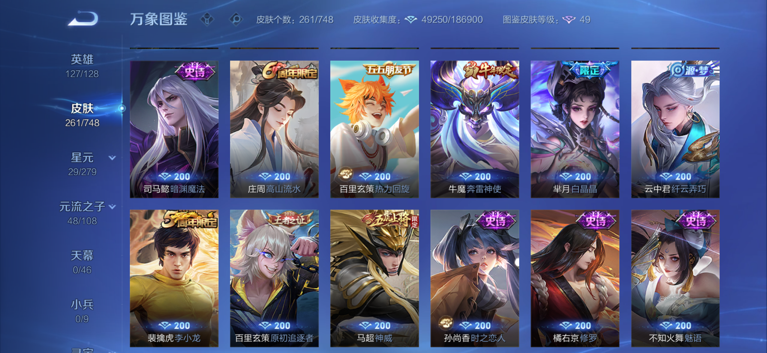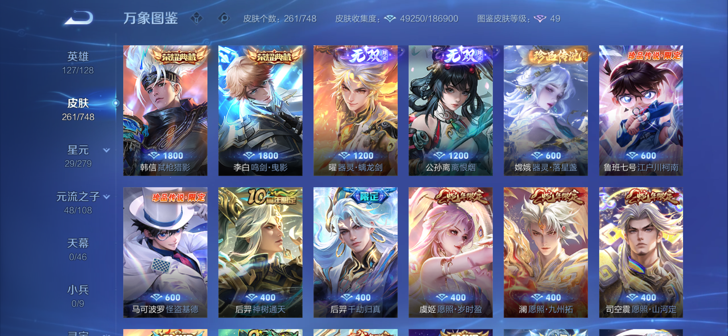 皮肤261 英雄127 荣耀王者 荣耀典藏2 无双皮肤2 珍品传说3 传说33 其他皮肤95-国服50刘备还有很多万战4000个紫星币现在