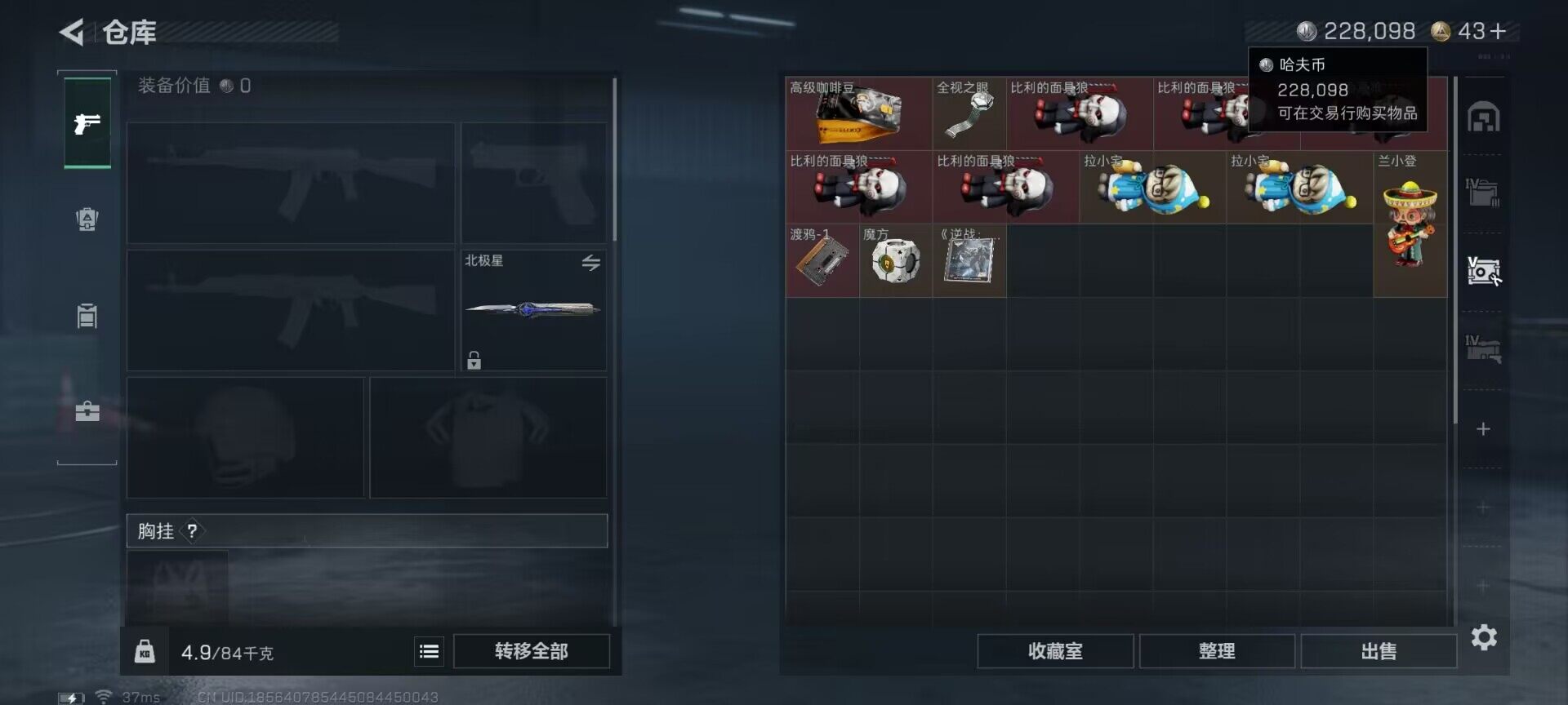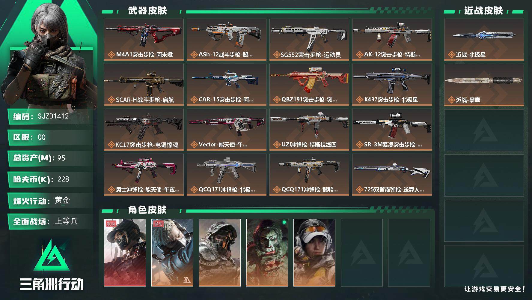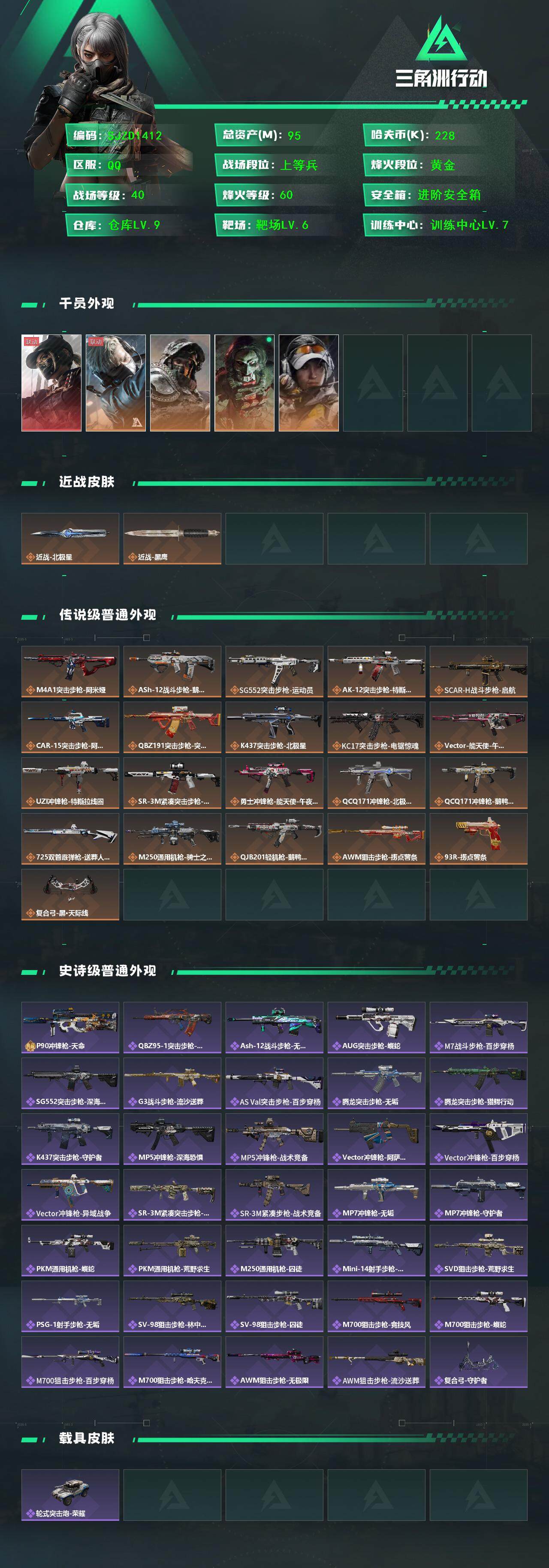 总资产(M):95M/哈夫币(K):228K/哈夫币(K):228K/全面战场等级:40_段位:上等
