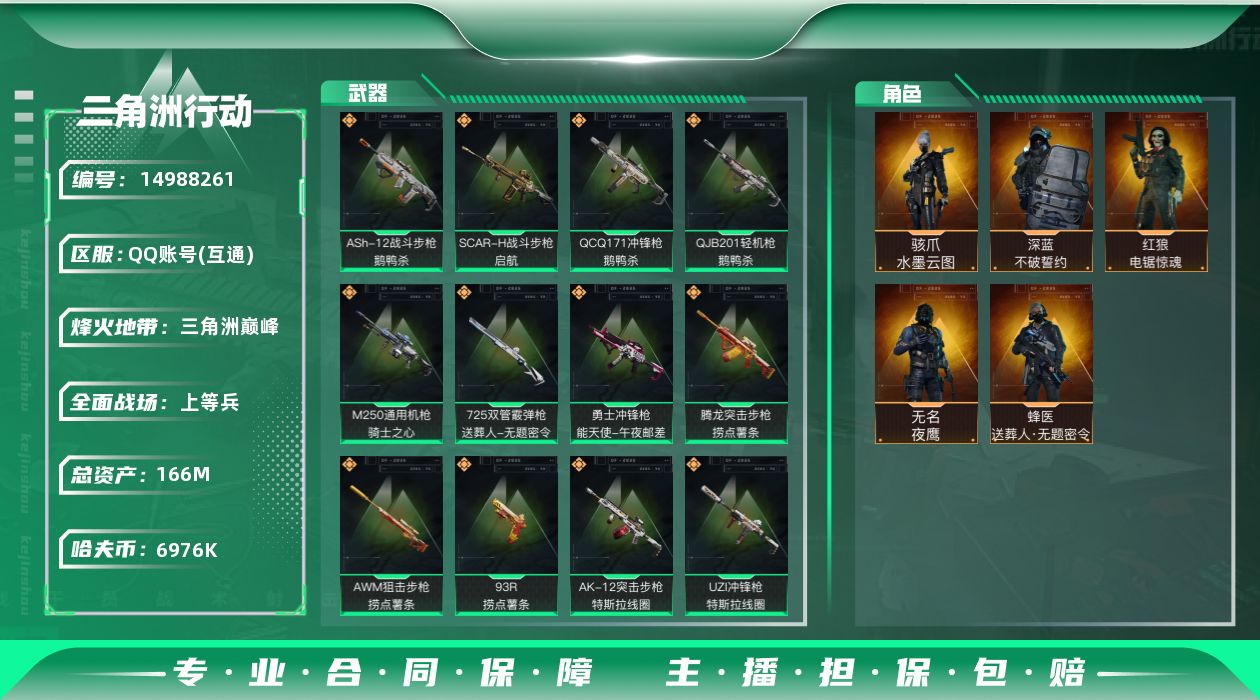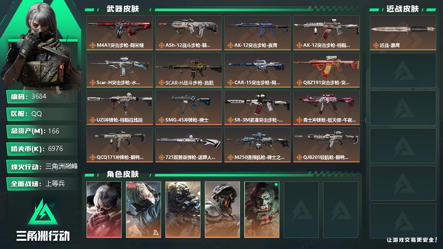 总资产166m 流动资产131m 哈夫币6976k 1刀皮 6干员皮 顶级安全箱 仓库lv8 训练中