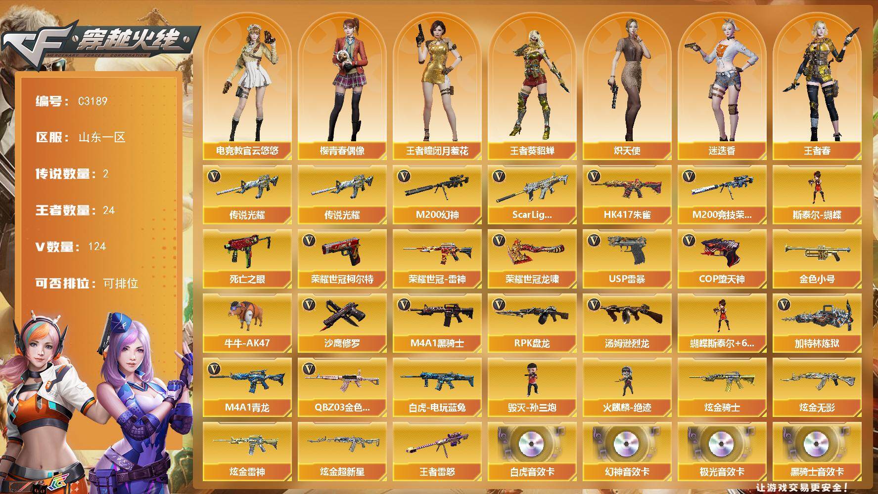 【热门武器】:传说光耀,QBZ03-金色蔷薇,Scar Light-白虎,HK417-朱雀,M4A1-青龙,M200-幻神,M200-竞技荣光,死亡之眼,荣耀世冠-雷神,白虎-电玩蓝兔,荣耀世冠-柯尔特,金色小号,牛牛-AK47,M4A1-黑骑士*5,汤姆逊-烈龙*6,RPK-盘龙*2,加特林-炼狱*2,斯泰尔-蝴蝶,毁灭-孙三炮,火麒麟-绝迹,USP-雷暴,COP-堕天神,沙鹰-修罗*5,荣耀世