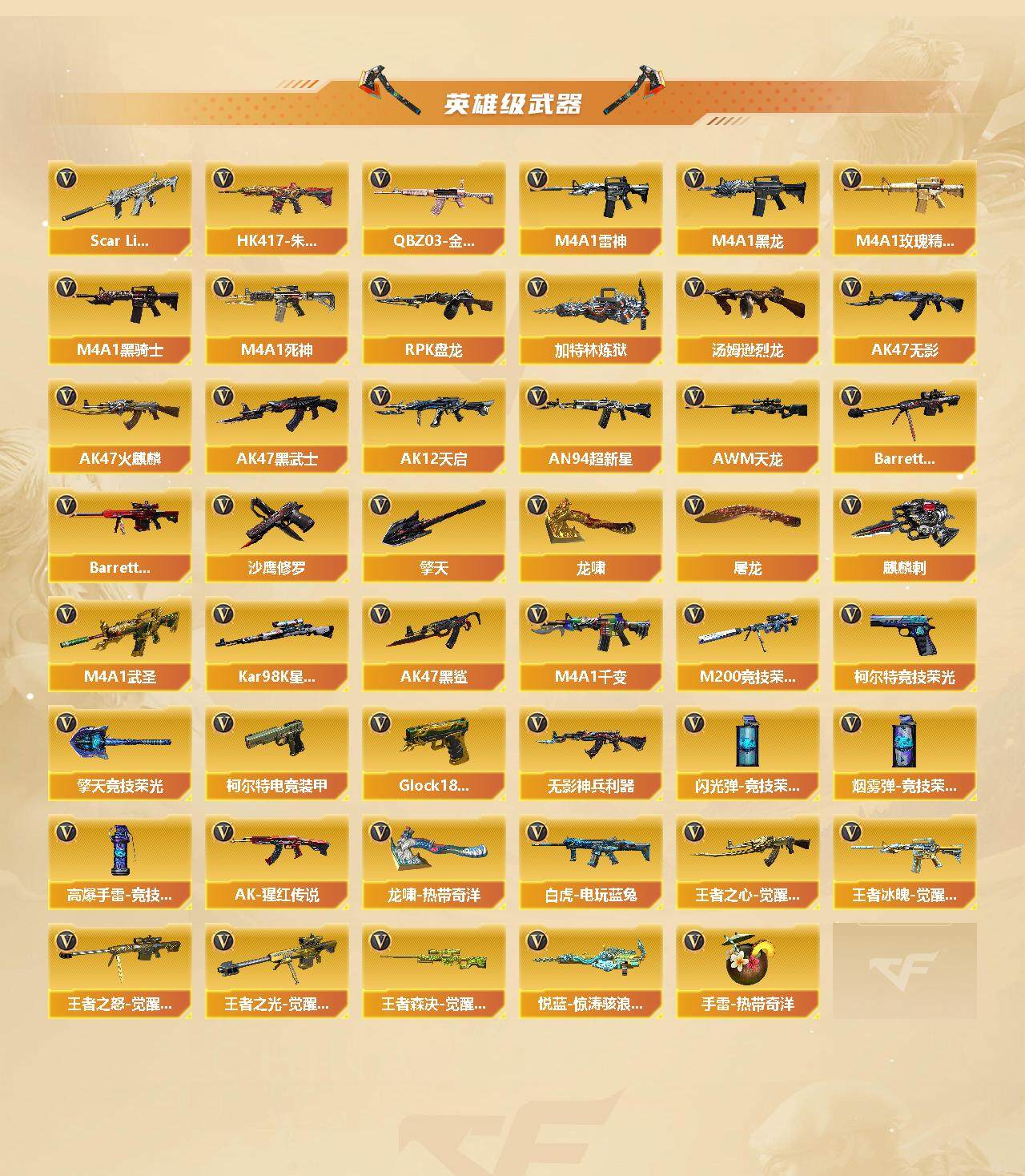 【热门武器】:传说暗裔,QBZ03-金色蔷薇,Scar Light-白虎,HK417-朱雀,M200-竞技荣光,死亡之眼,白虎-电