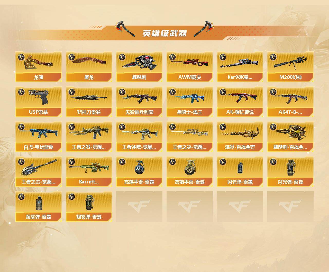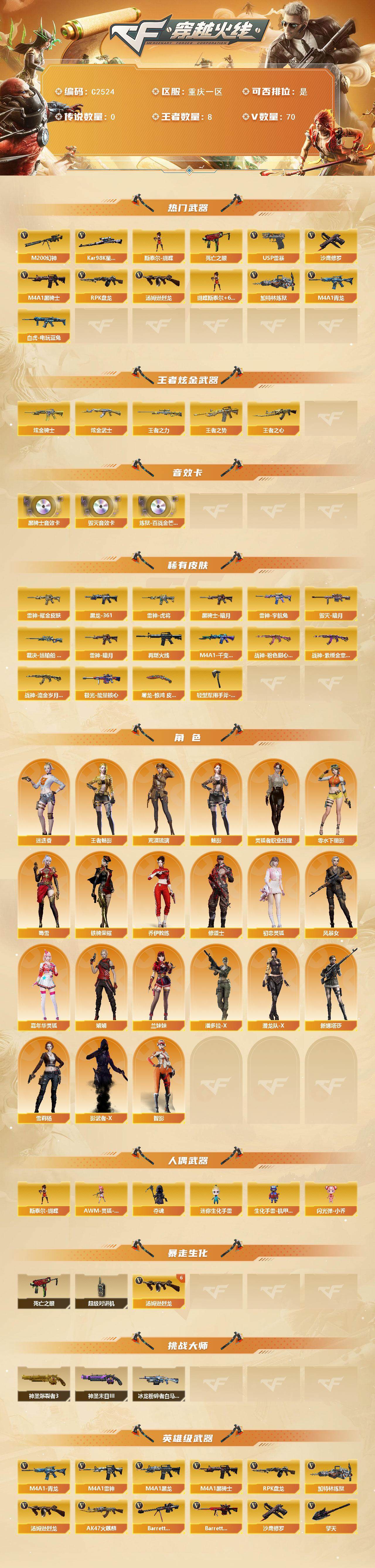 【C2524】重庆一区-70V-8王者-3炫金【双全号 M4A1-青龙,M200-幻神,死亡之眼,白虎-电玩蓝兔,Kar98K-星神,M4A1-黑骑士,汤姆逊-烈龙*6,RPK-盘龙*3,加特林-炼狱*3,斯泰尔-蝴蝶,USP-雷暴,沙鹰-修罗】