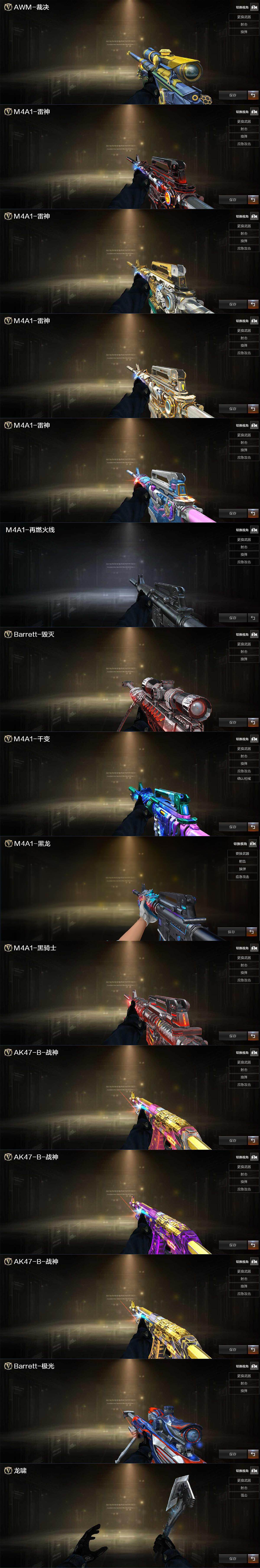 【热门武器】:M4A1-青龙,M200-幻神,死亡之眼,白虎-电玩蓝兔,Kar98K-星神,M4A1-黑骑士,汤姆逊-烈龙*6,RPK-盘龙*3,加特林-炼狱*3,斯泰尔-蝴蝶,USP-雷暴,沙鹰-修罗