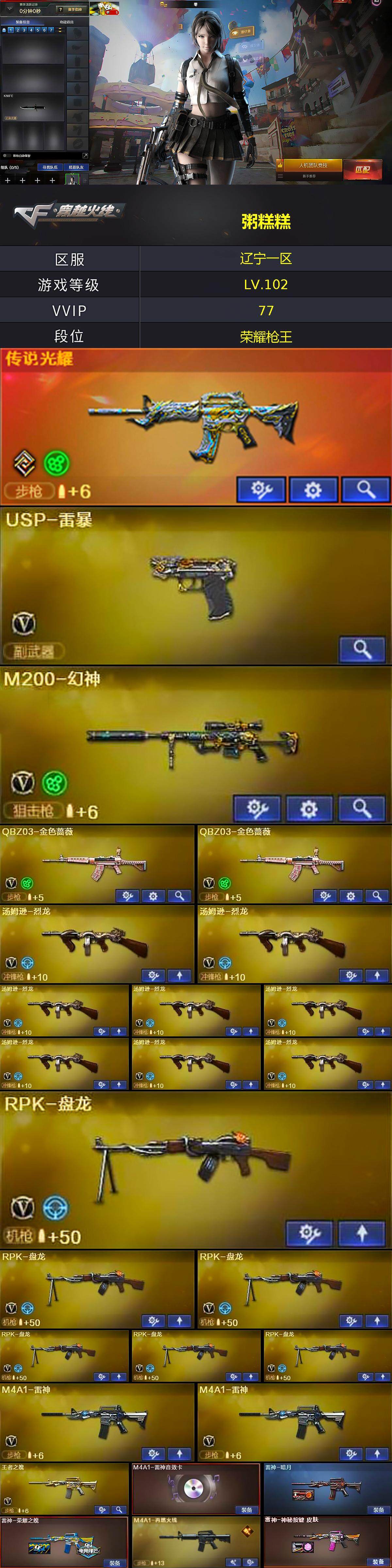 【热门武器】:传说光耀,QBZ03-金色蔷薇*2,HK417-朱雀,M200-幻神,死亡之眼,M4A1-黑骑士,汤姆逊-烈龙*8,RPK-盘龙*6,加特林-炼狱,斯泰尔-蝴蝶,降世魔童,USP-雷暴,沙鹰-修罗*3