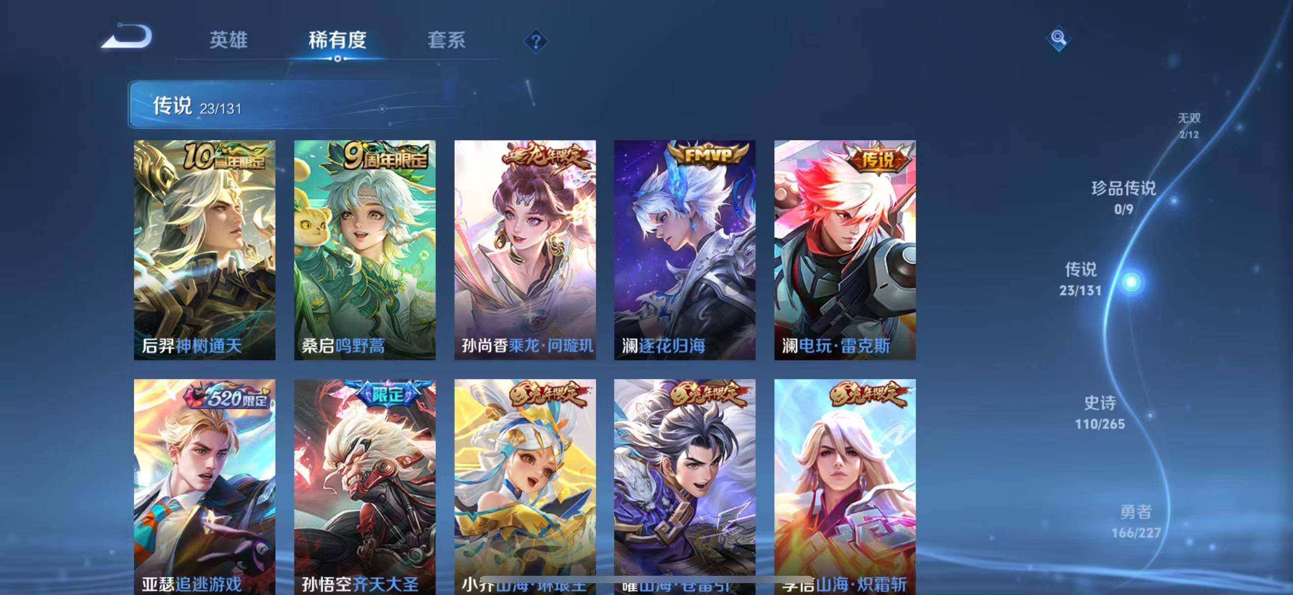 苹果Q-V9-最强王者段位-128英雄-384皮肤-3典藏皮肤-1典藏英雄-2无双-23传说-110史诗