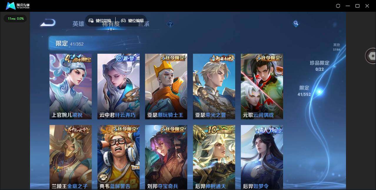 【限定皮肤】:狄仁杰阴阳师,赵云皇家上将,赵云龙胆,妲己时之彼端,孙尚香蔷薇恋人,阿轲迷踪丽影,吕布天魔缭乱,元歌云间偶戏,夏侯惇朔风刀,典韦蓝屏警告,狄仁杰魔术师,狄仁杰万华元夜,达摩沙漠行僧,