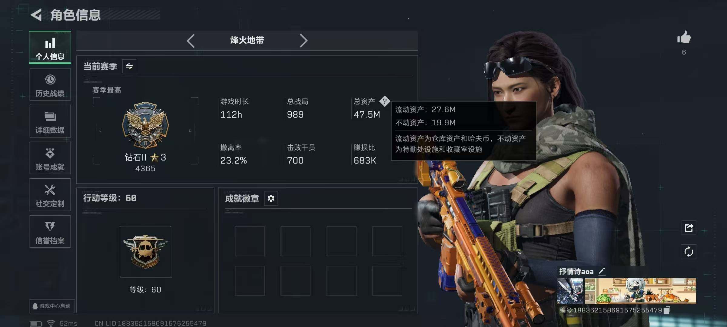 47m总资产-16436k哈伏币-60烽火等级-钻石-1战场等级-无军衔【干