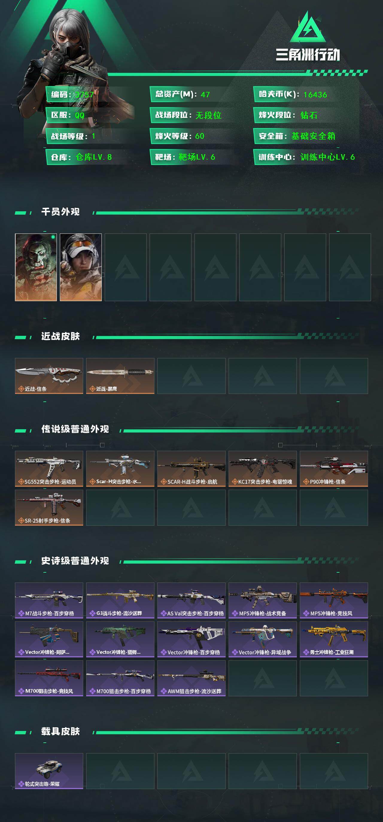 47m总资产-16436k哈伏币-60烽火等级-钻石-1战场等级-无军衔