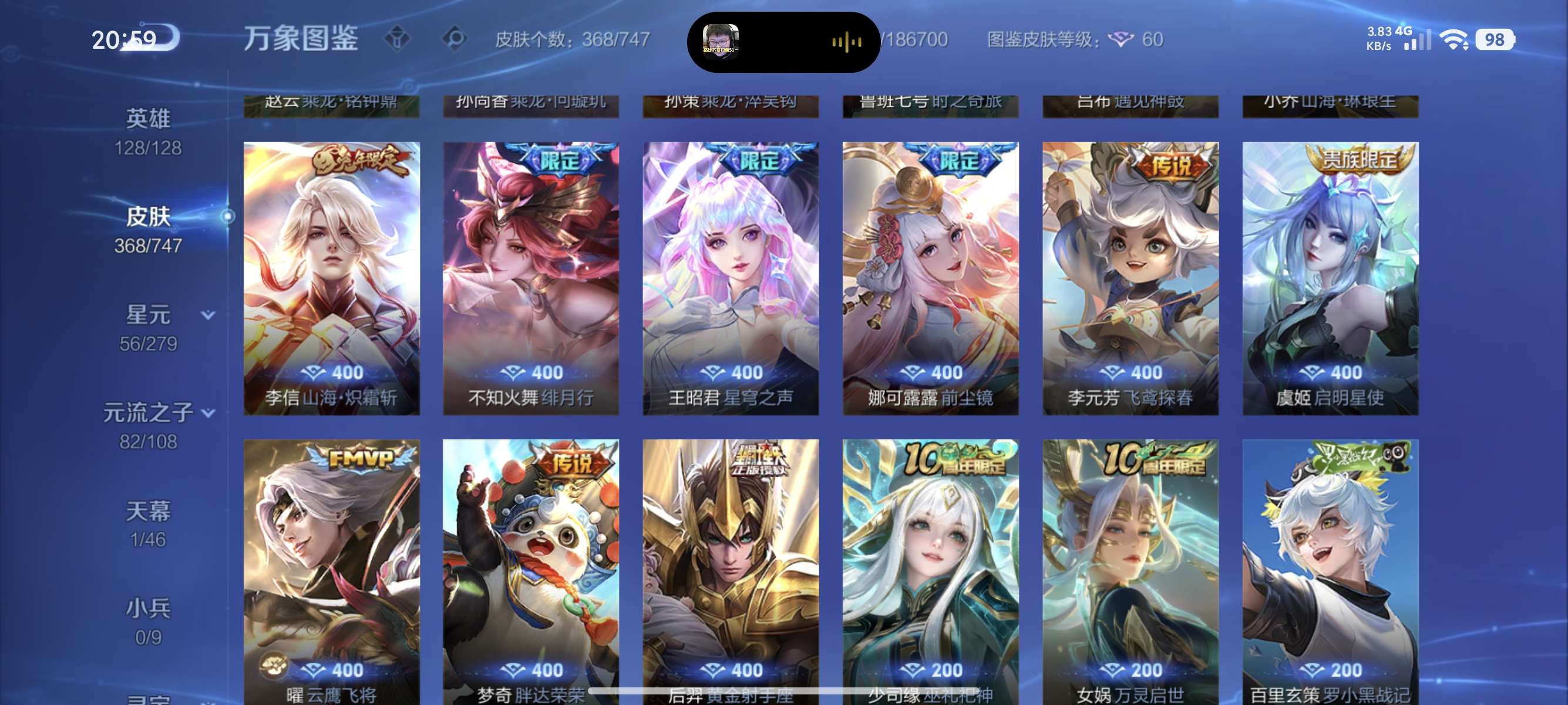 皮肤368 英雄128 尊贵铂金 荣耀典藏4 传说30 其他皮肤153-全英雄,360+皮,3典藏,30传说