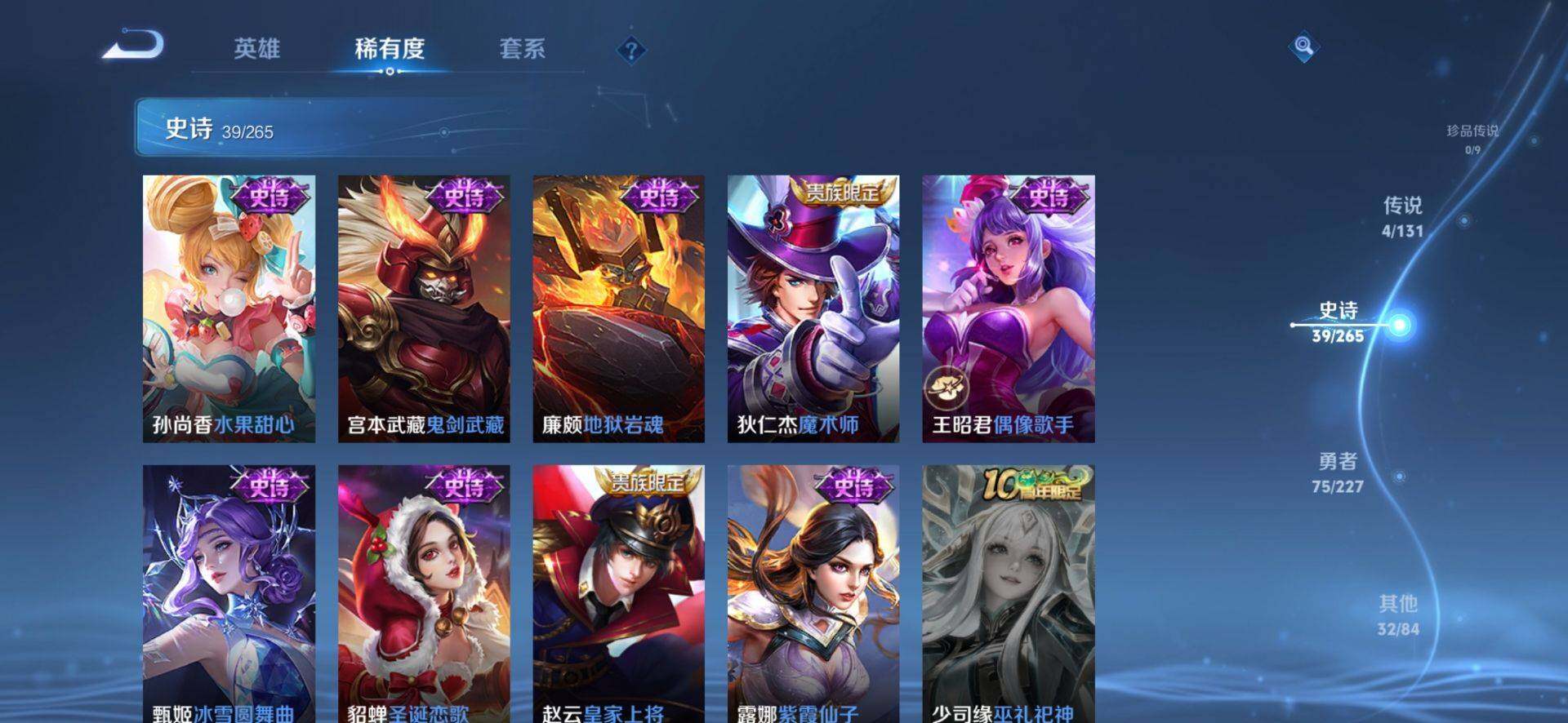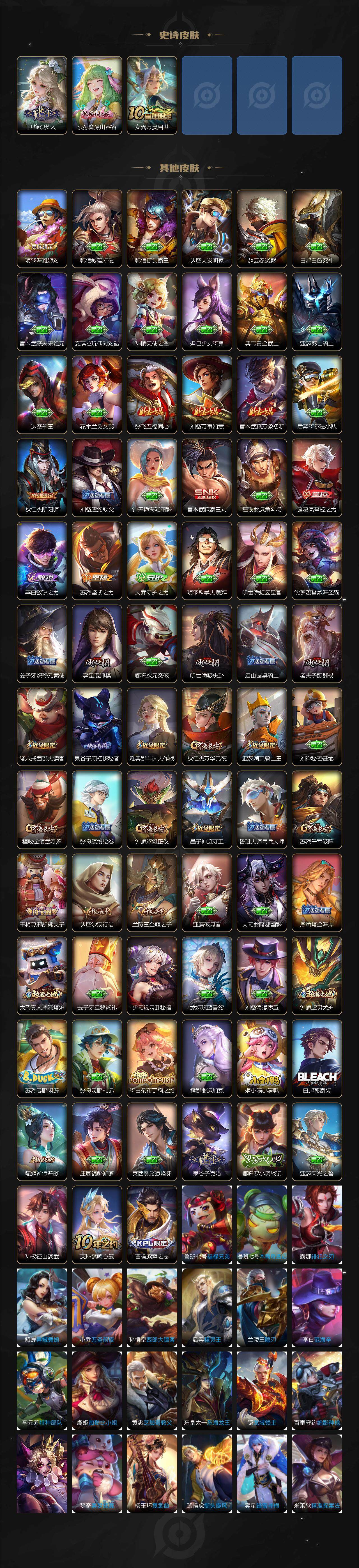 【限定皮肤】:狄仁杰阴阳师,赵云皇家上将,墨子神迹守卫,元歌云间偶戏,马可波罗山海玄木吟,狄仁杰魔术师,狄仁杰万华元夜,达摩沙漠行僧,项羽海滩派对