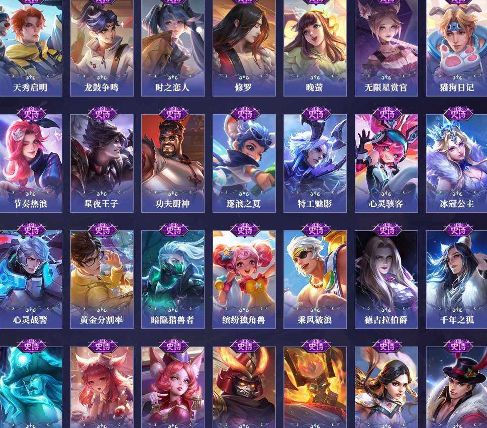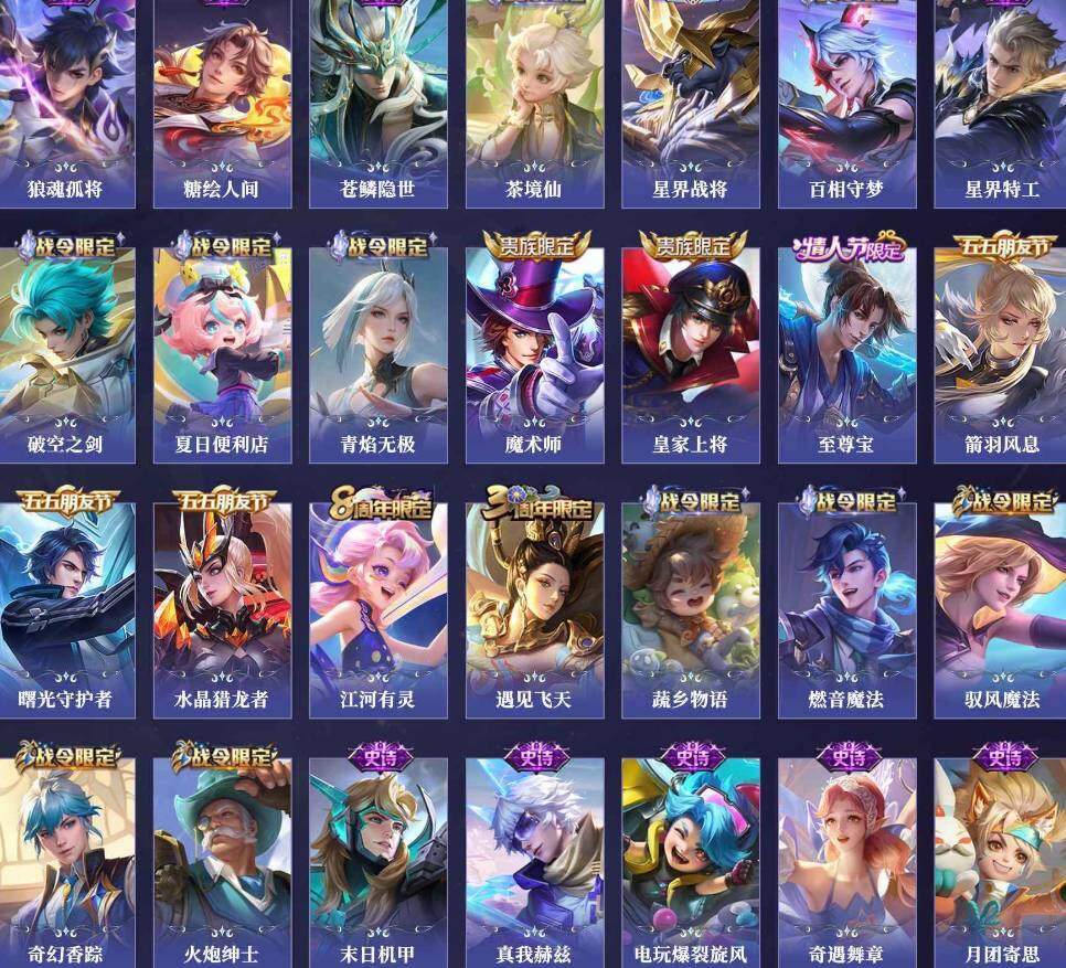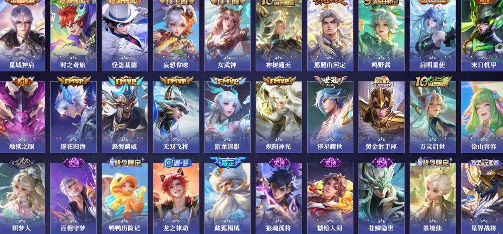 【传说皮肤】:后羿神树通天,司空震愿照山河定,桑启鸣野蒿,澜逐花归海,吕布怒海麟威,马超无双飞将,赵云淬星耀世,西施游龙清影,镜炽阳神光,虞姬启明星使