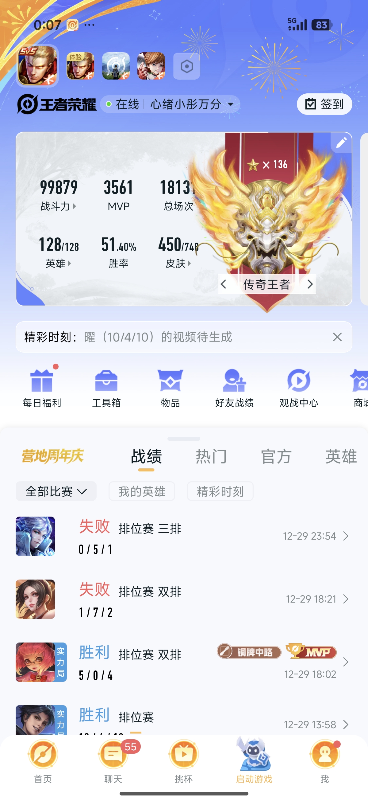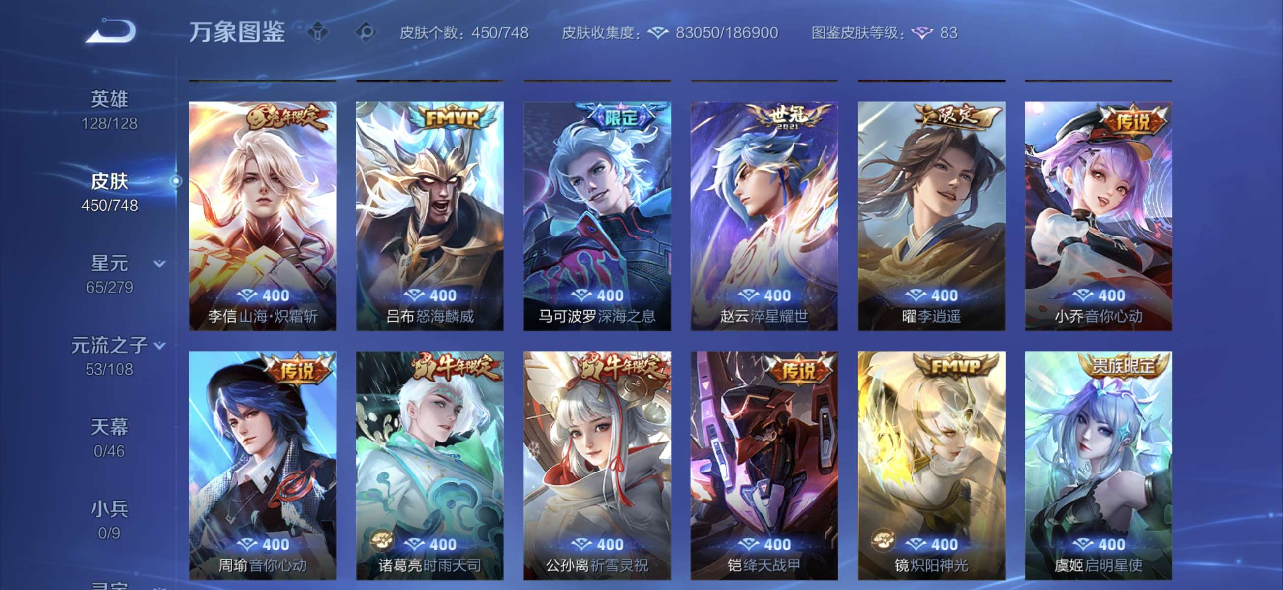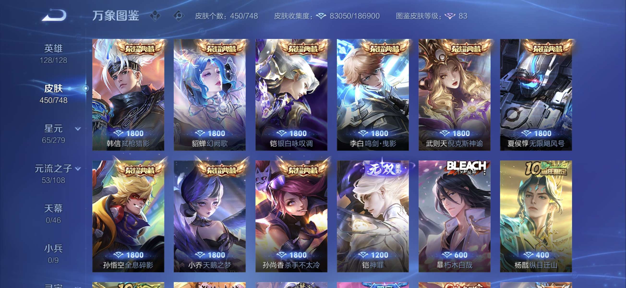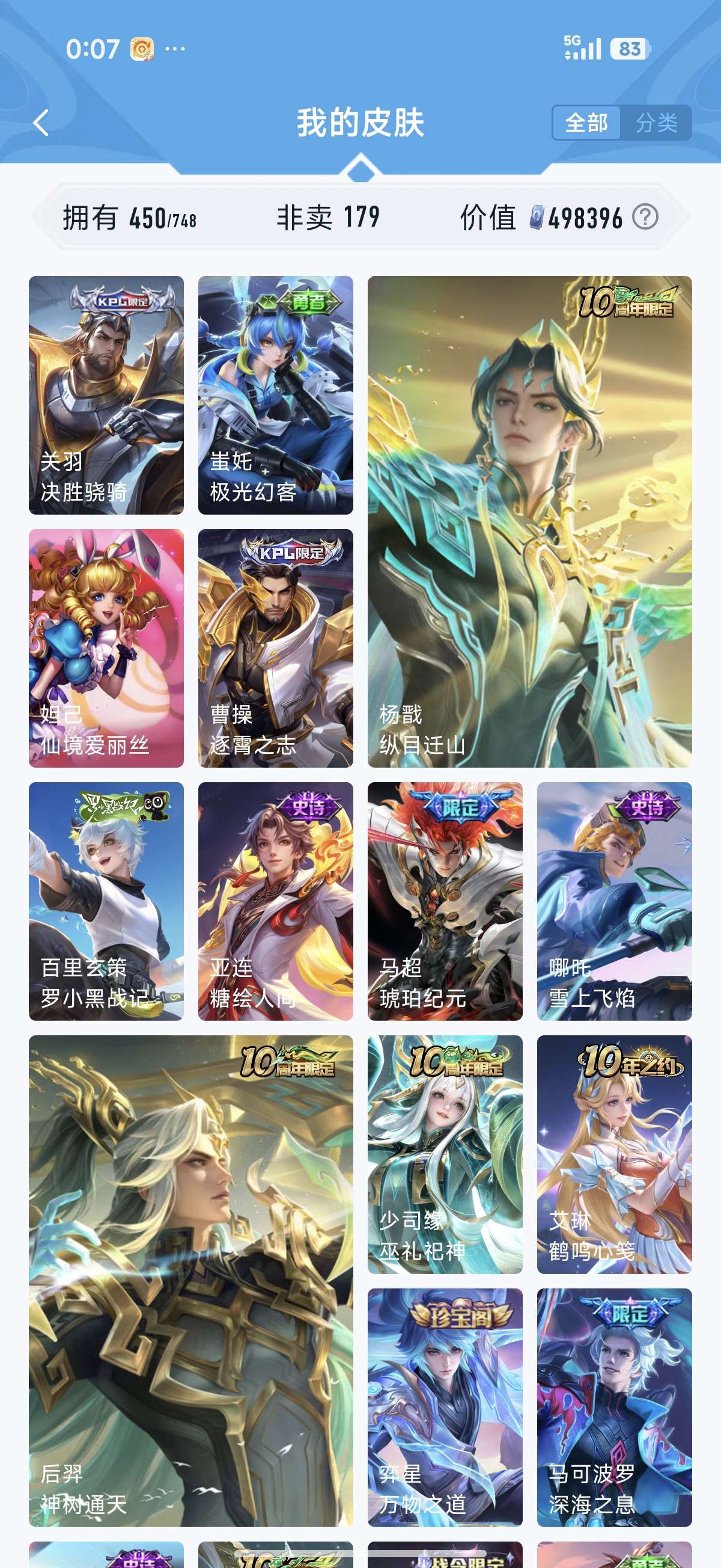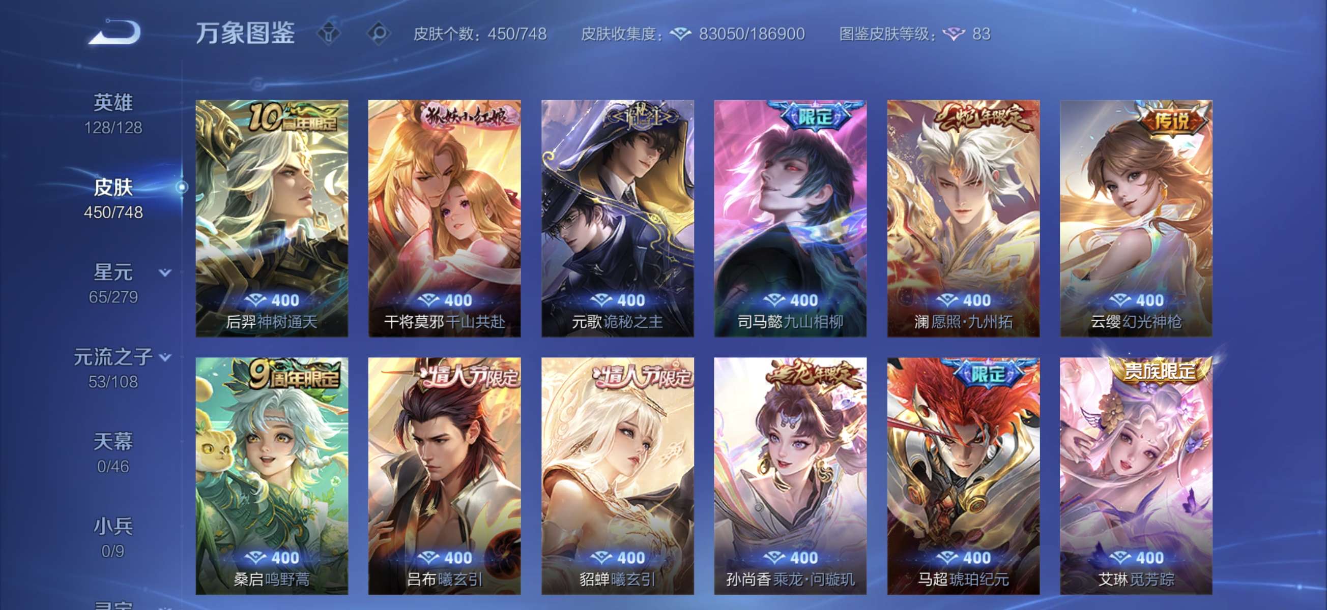 皮肤450 英雄128 传奇王者 荣耀典藏10 无双皮肤1 珍品传说2 传说38 其他皮肤185-v10多典藏便宜出售,差60抽出荣耀水晶