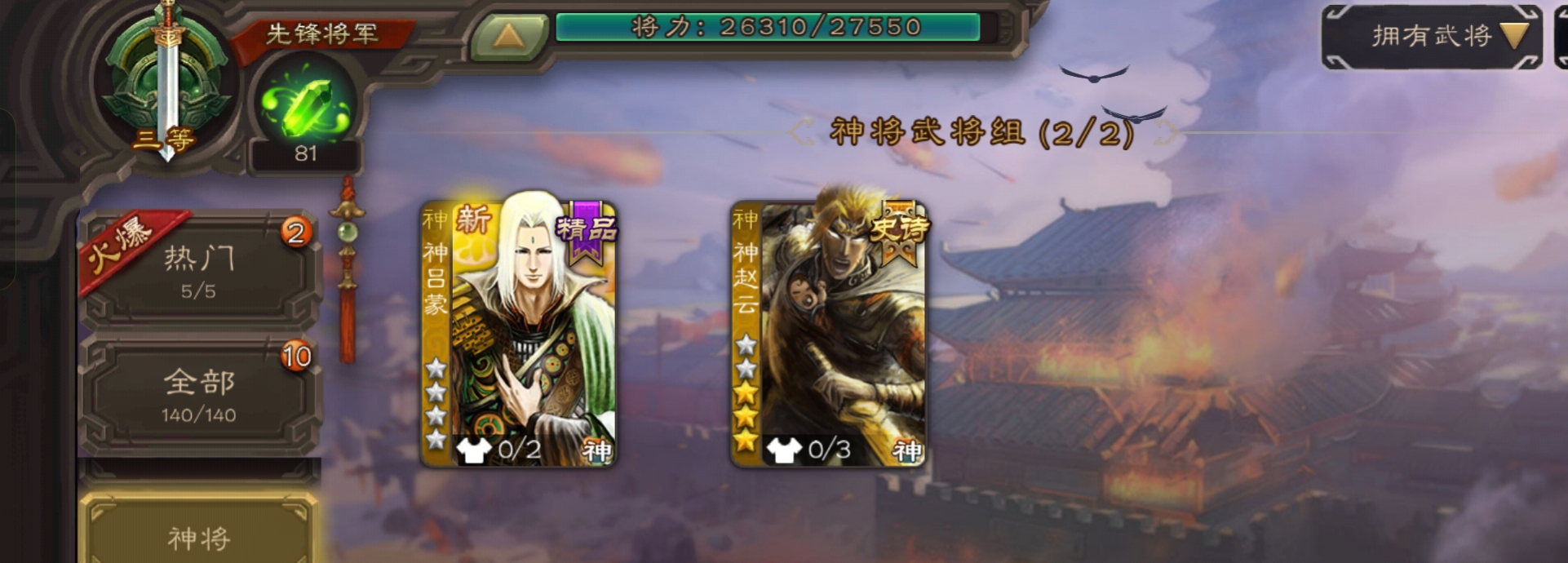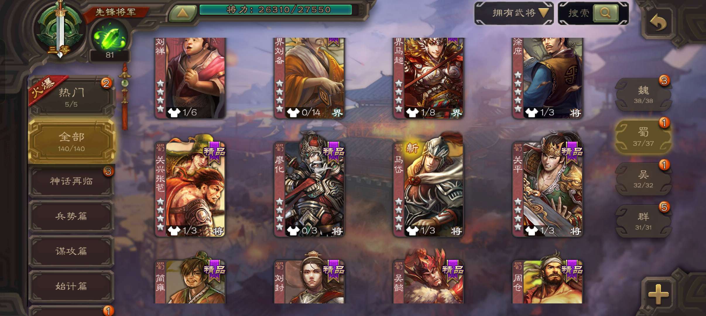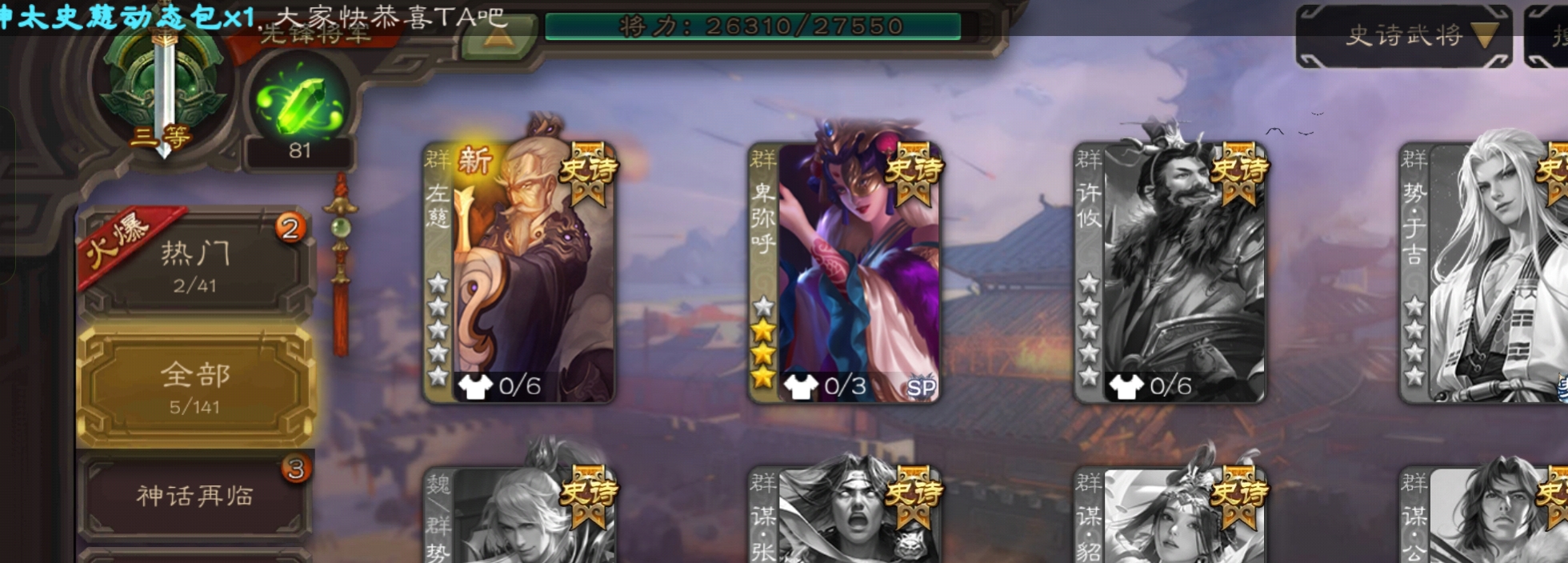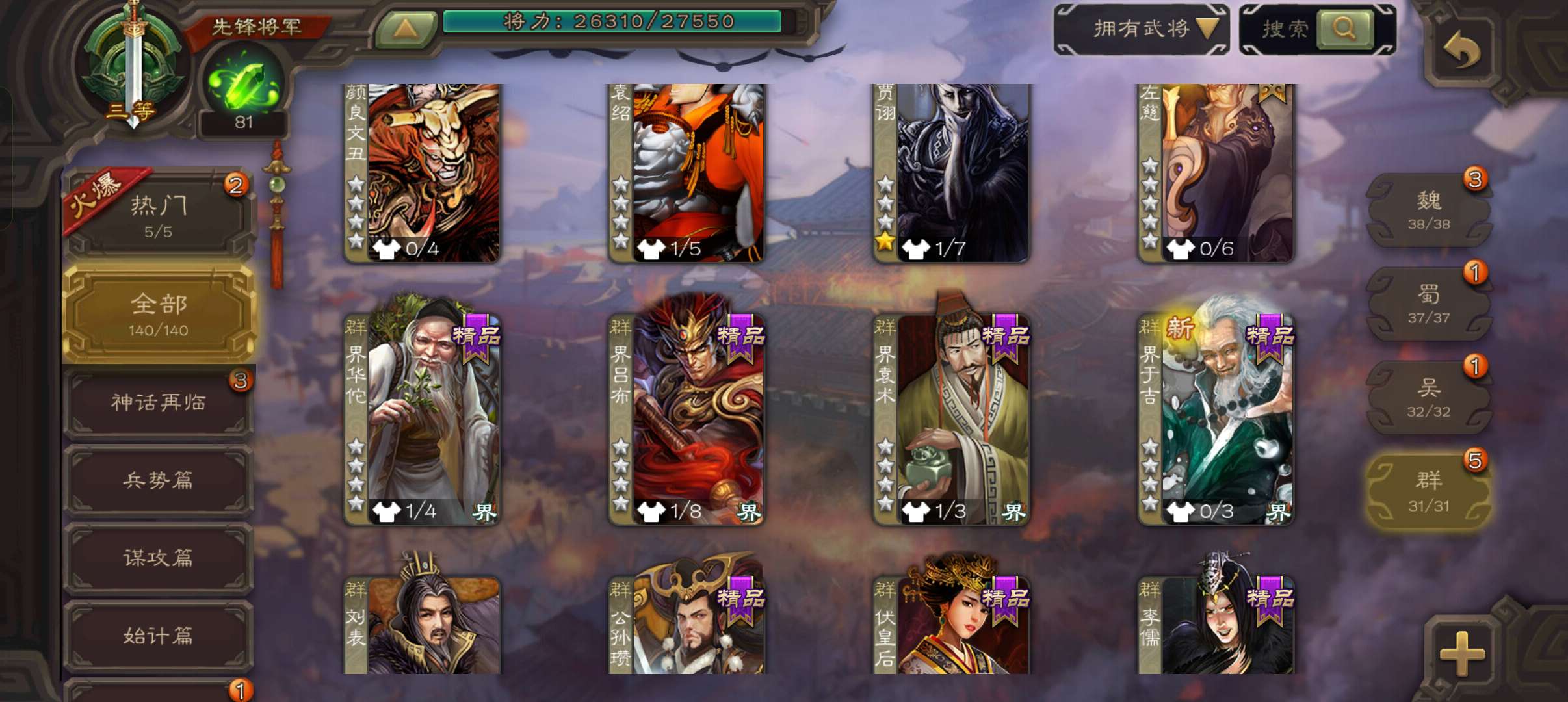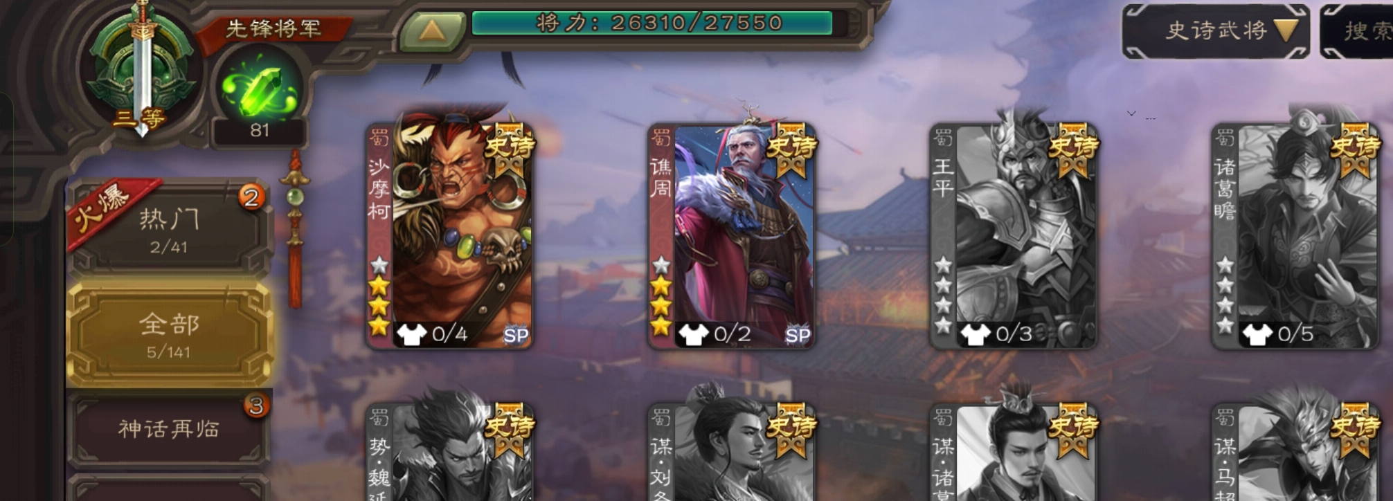 5史诗先锋,8万羽毛6万豆,神赵云卑弥呼沙摩柯谯周左慈,神吕蒙动曹冲动界陆逊界吕布140将