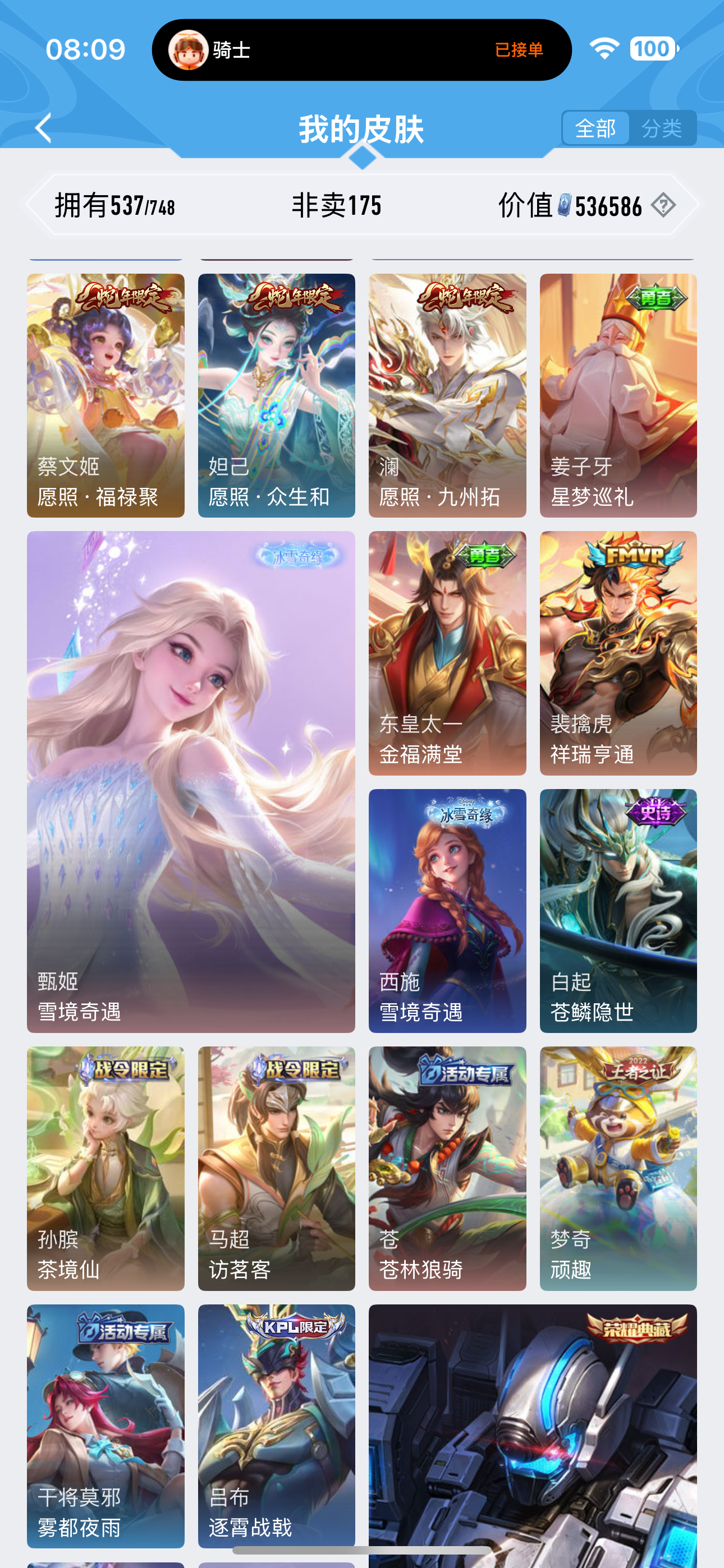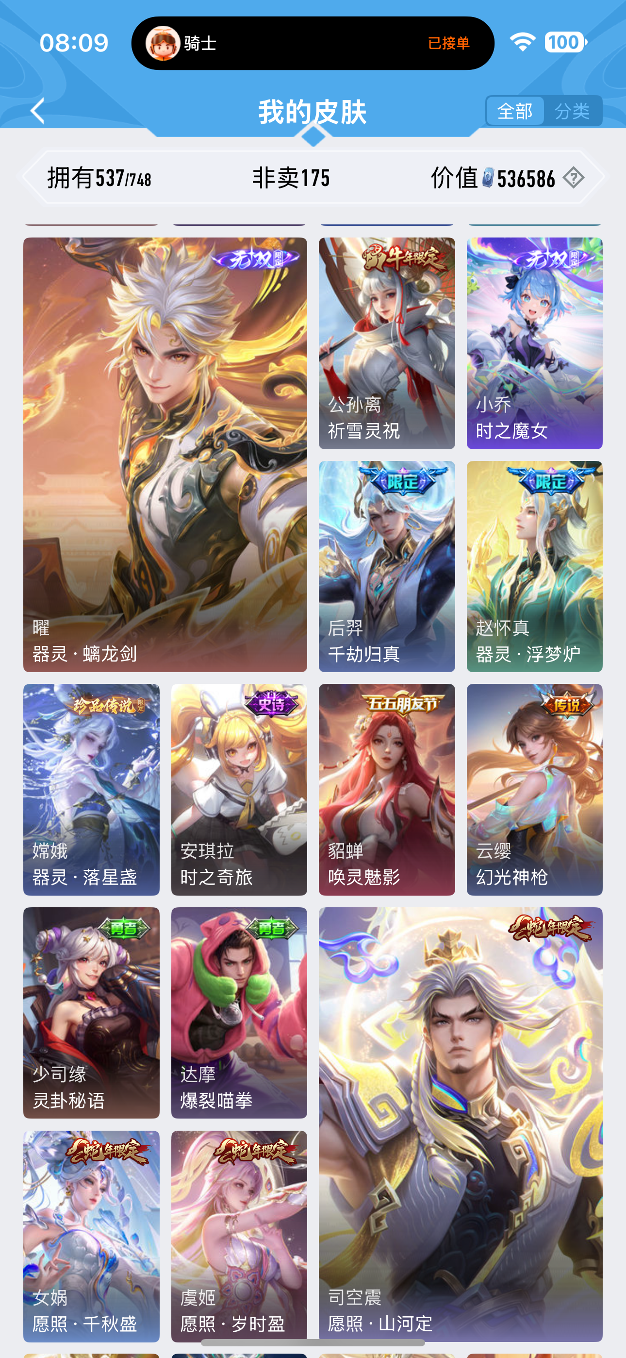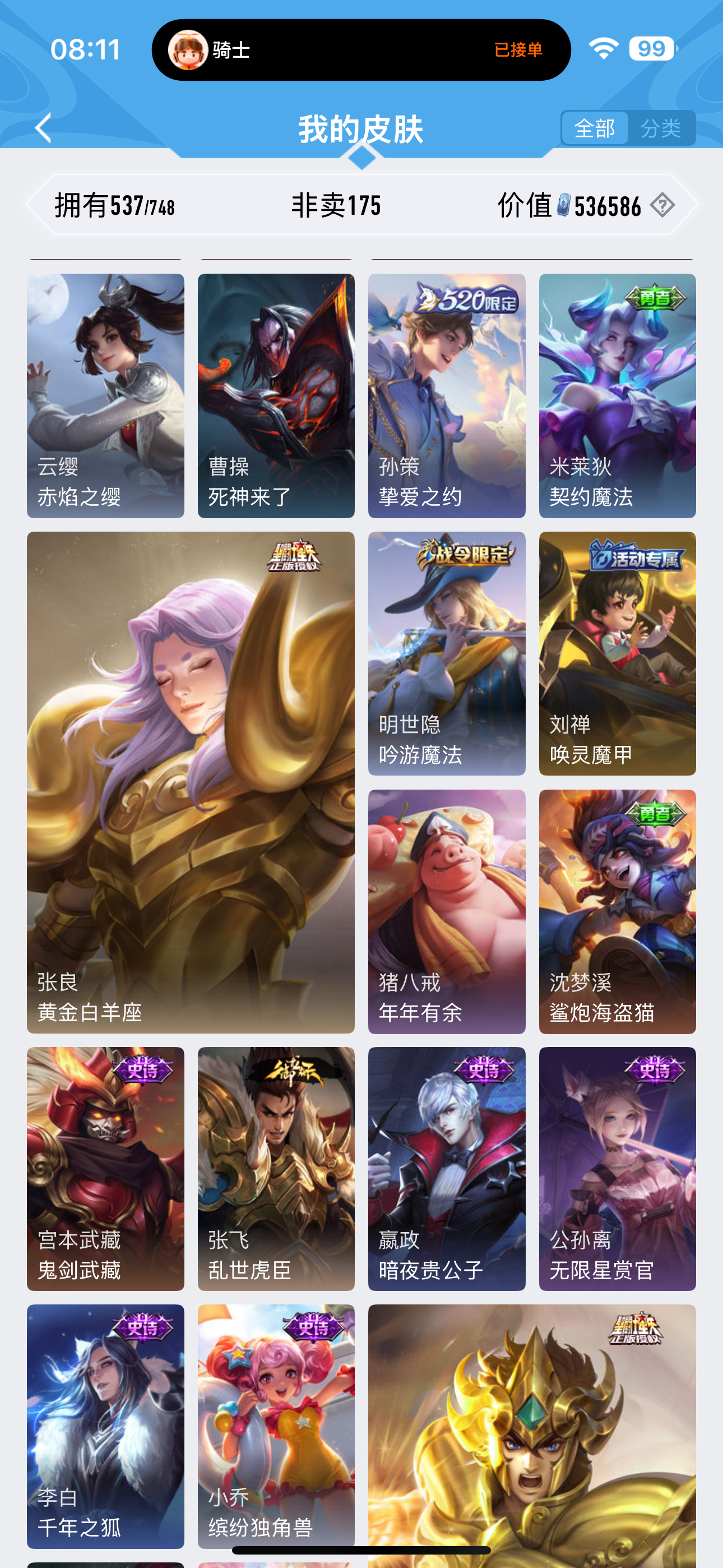 皮肤537 英雄127 至圣王者 荣耀典藏6 珍品无双1 无双皮肤4 珍品传说9 传说79 其他皮肤208-无双贵10 可二次