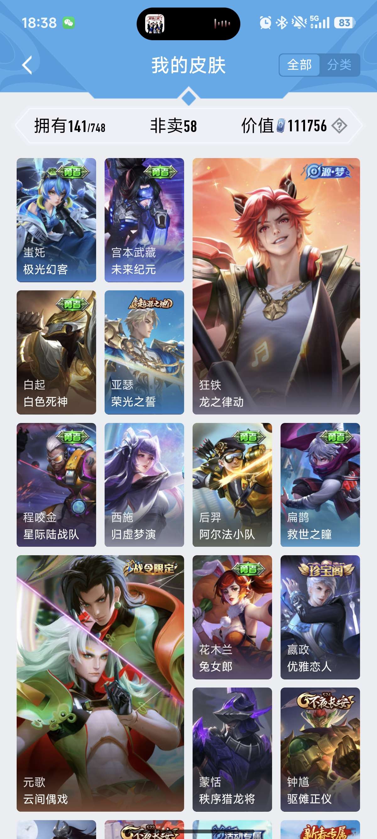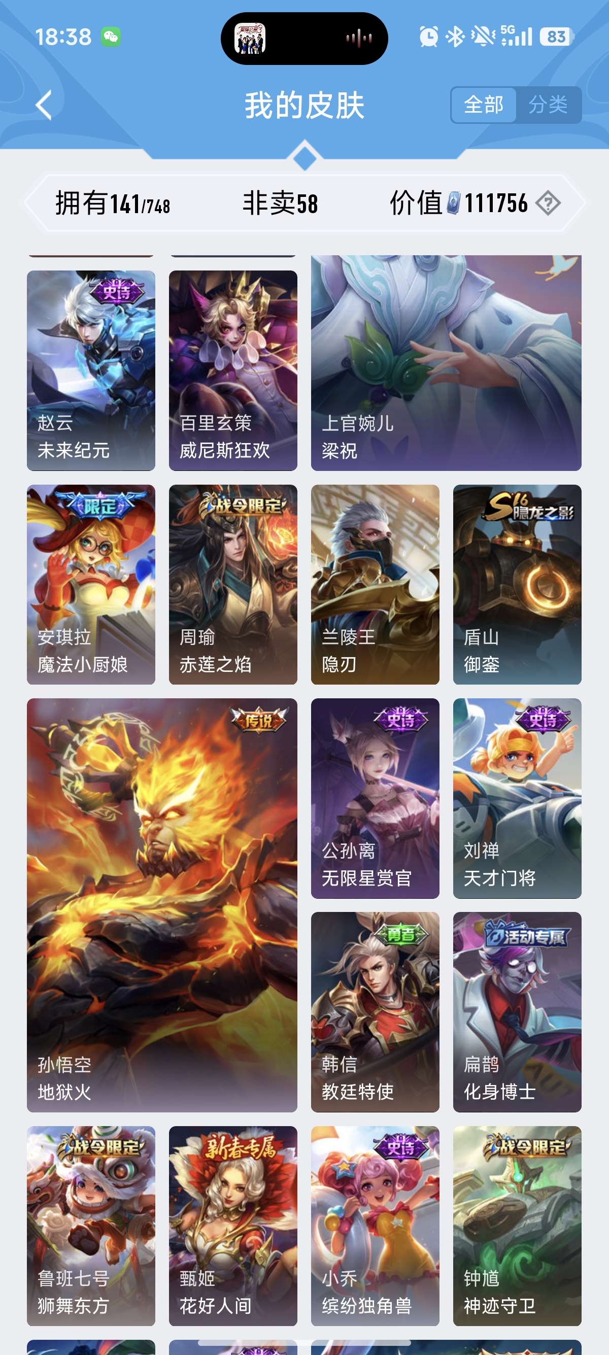 皮肤141 英雄117 绝世王者 荣耀典藏1 传说6 其他皮肤70-全息碎影 v8多限定皮肤