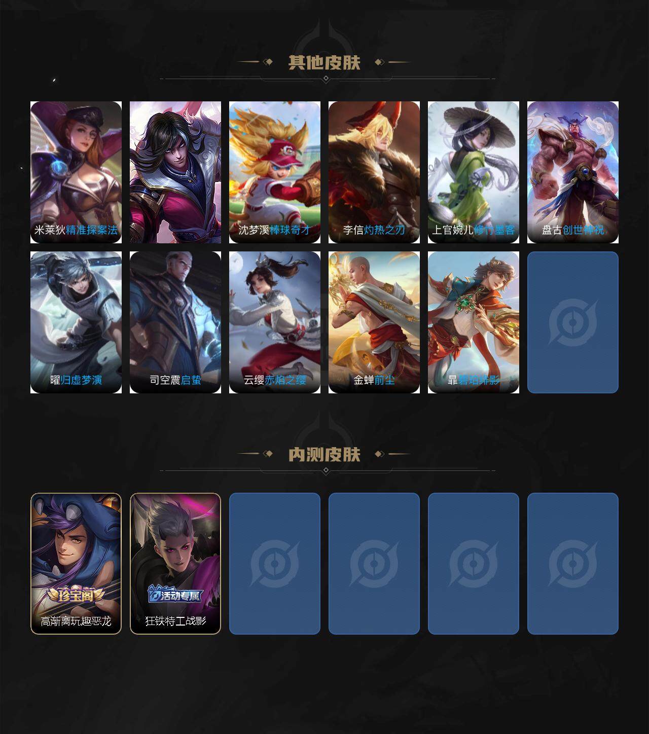 【限定皮肤】:蒙犽顽岩魄,姜子牙天穹之誓,狄仁杰阴阳师,赵云皇家上将,高渐离玩趣恶龙,元歌云间偶戏,马可波罗暗影游猎,狄仁杰魔术师,狄仁杰万华元夜,达摩沙漠行僧,项羽海滩派对,老夫子醍醐杖,程咬金演武夺筹,亚瑟潮玩骑士王,钟馗驱傩正仪,鬼谷子原初探秘者,苏烈千军破阵,百里