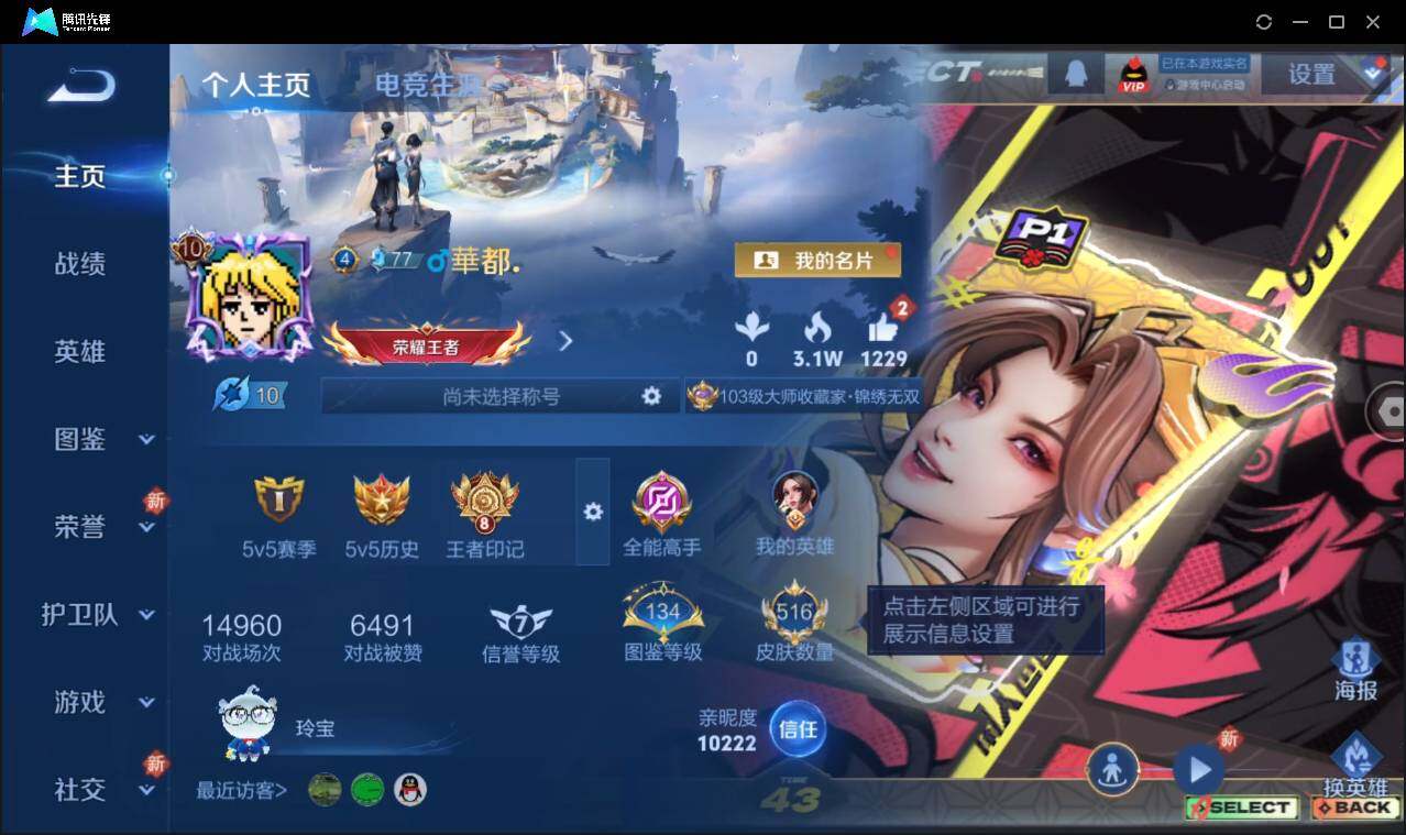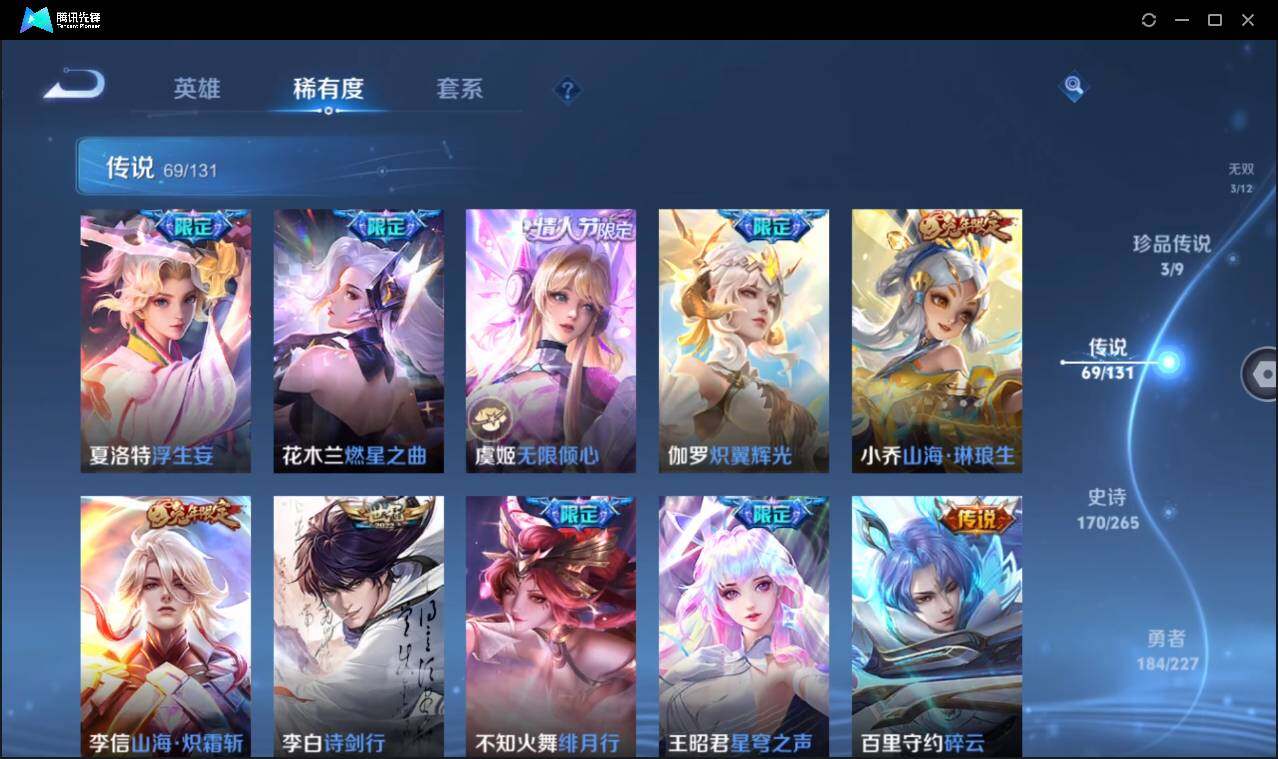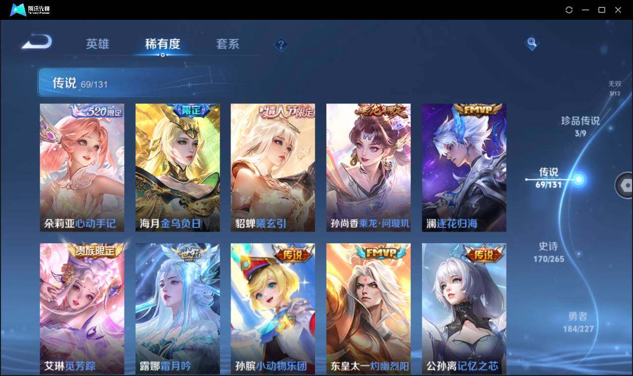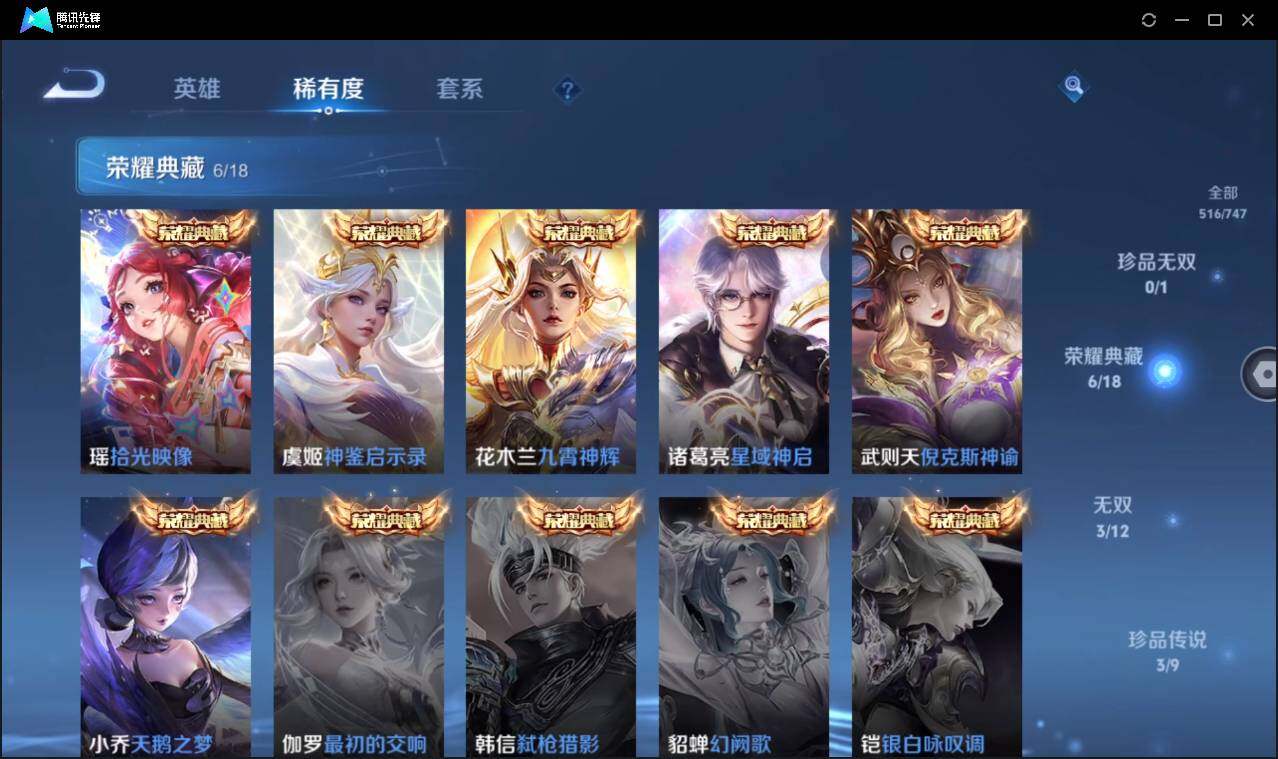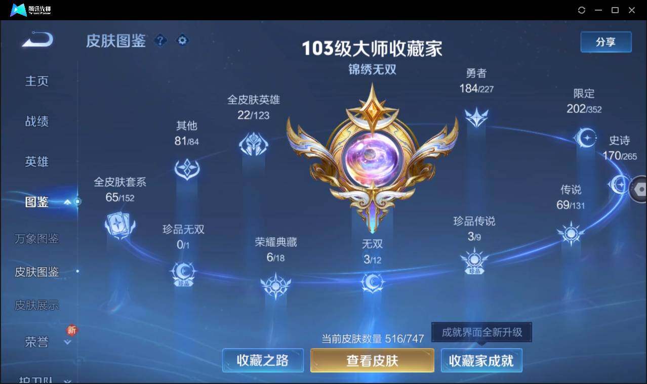 皮肤516 英雄128 至尊星耀 荣耀典藏7 无双皮肤3 珍品传说4 传说69 其他皮肤213-