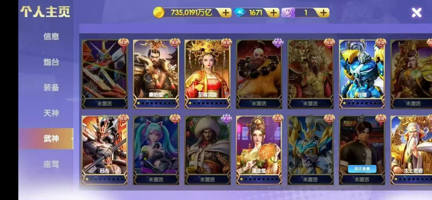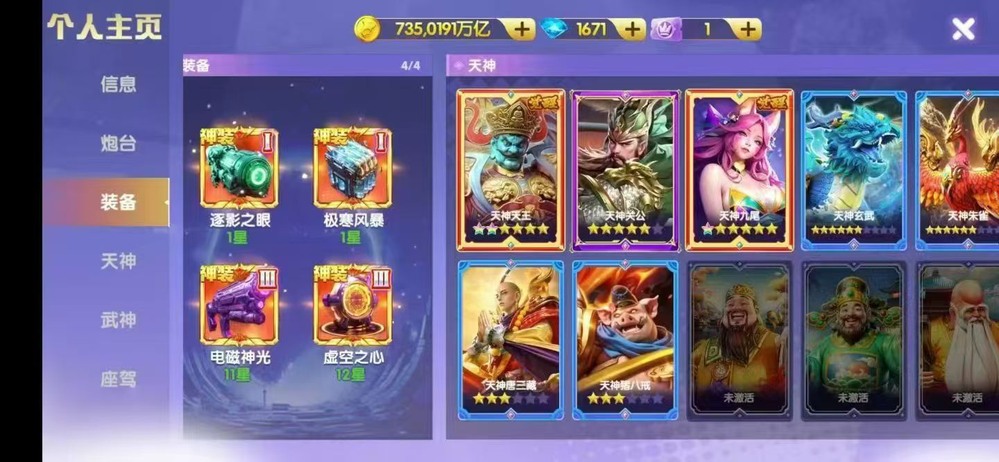 735兆,2万炮神装21连击,天神双觉醒双龙,洪荒三级西游羁绊,14武神连击2100优惠出