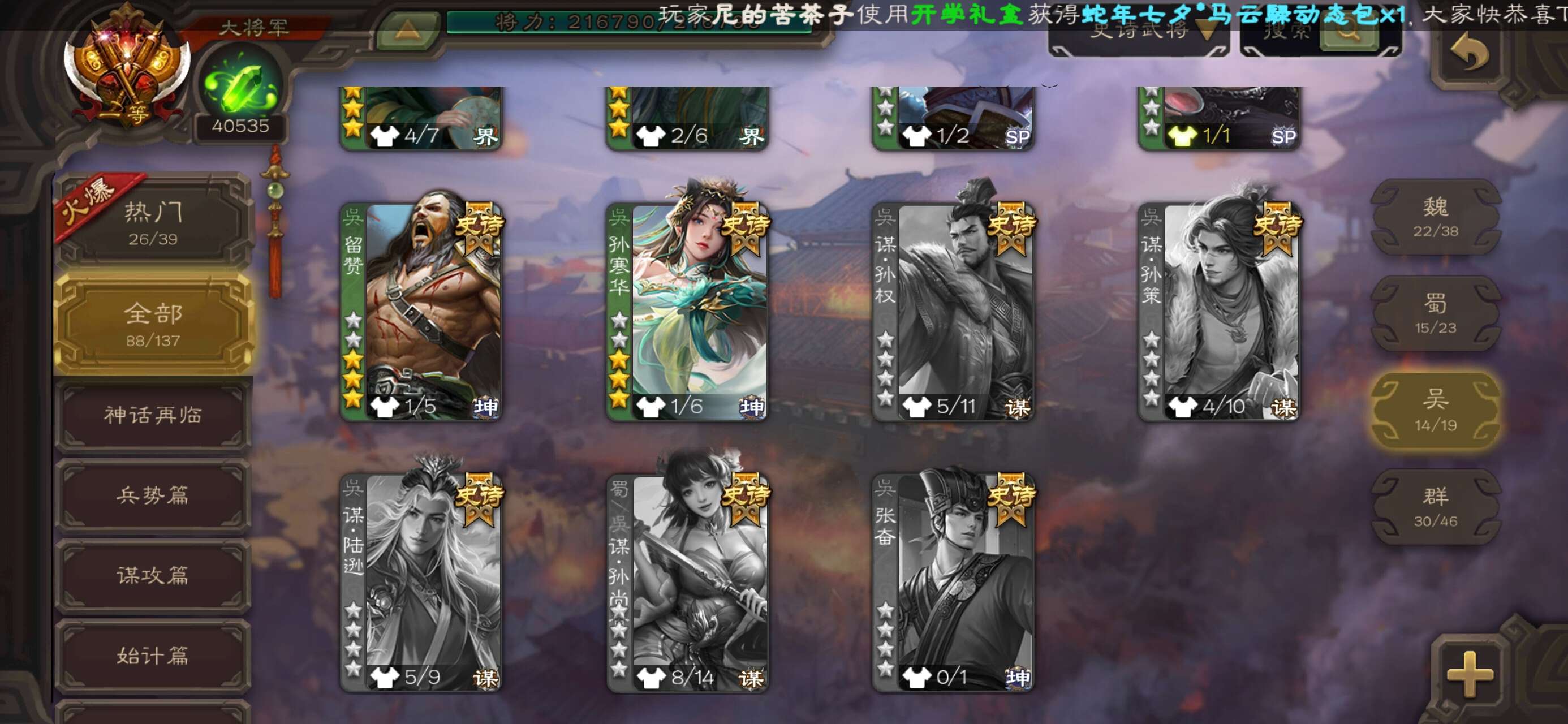 86史诗多动皮 神郭嘉神孙策神司马懿势太曹丕火龙果势于吉杨彪小仙女谋貂蝉等等还有很多强力武将