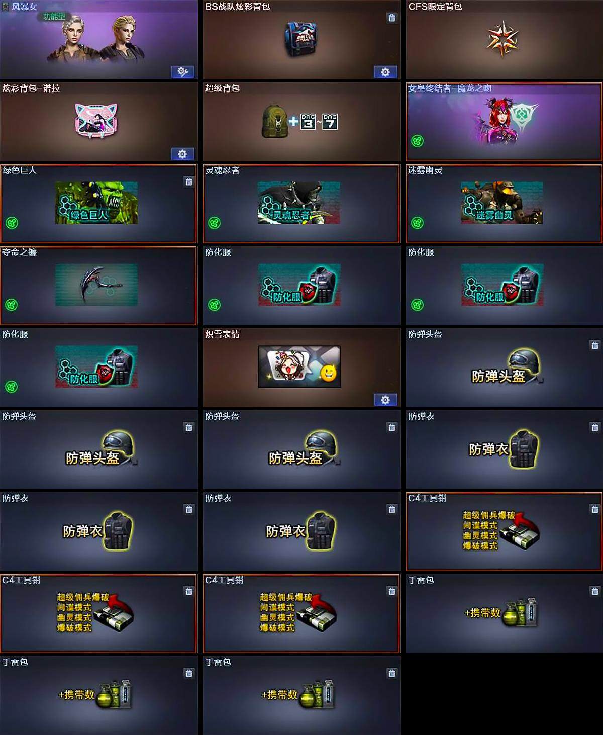 【道具】:BS战队炫彩背包,CFS限定背包,炫彩背包-诺拉,超级背包,女皇终结者-魔龙之吻,绿色巨人,灵魂忍者,迷雾幽灵,夺命之镰,防化服*3,炽雪表情,防弹头盔*3,防弹衣*3,C4工具钳*3,手雷包*3