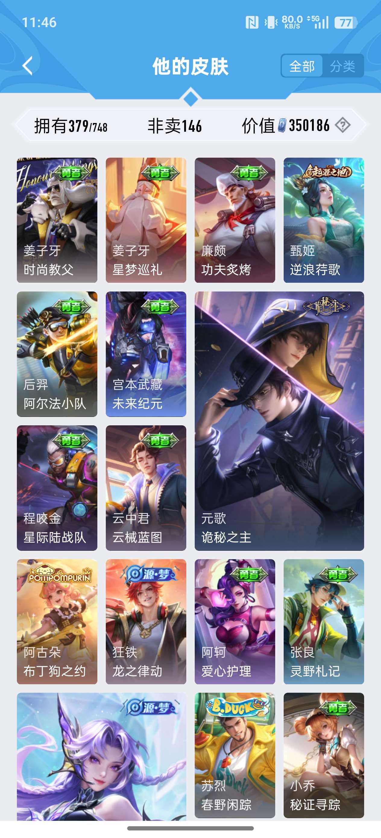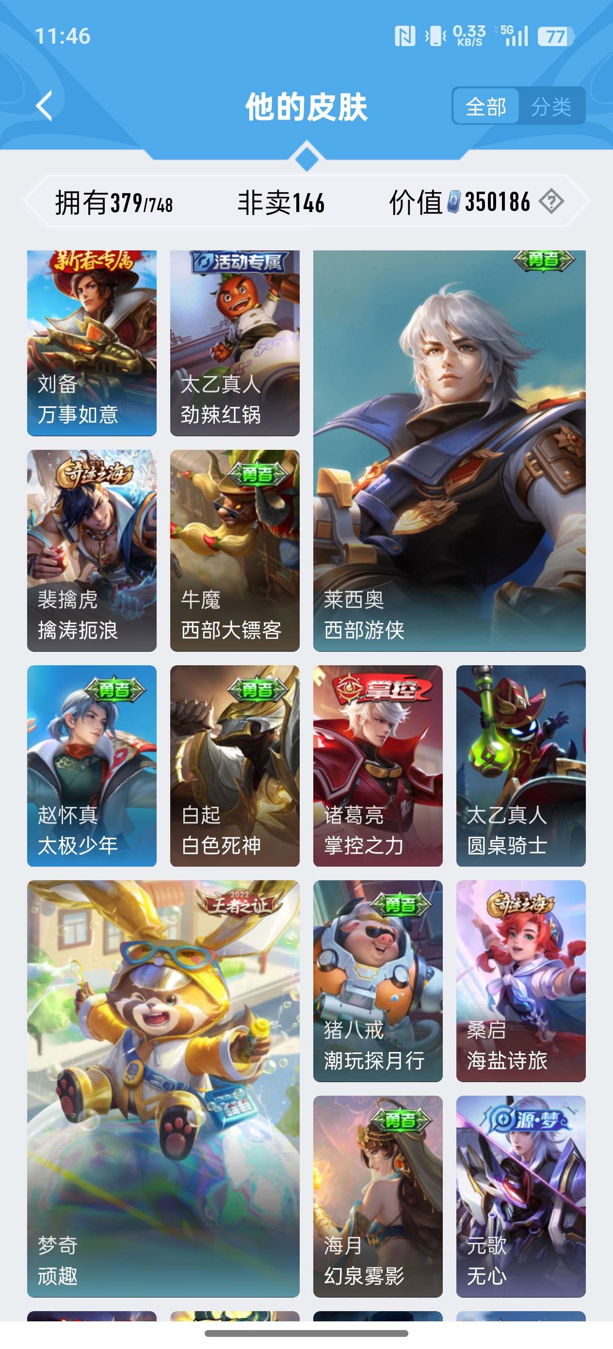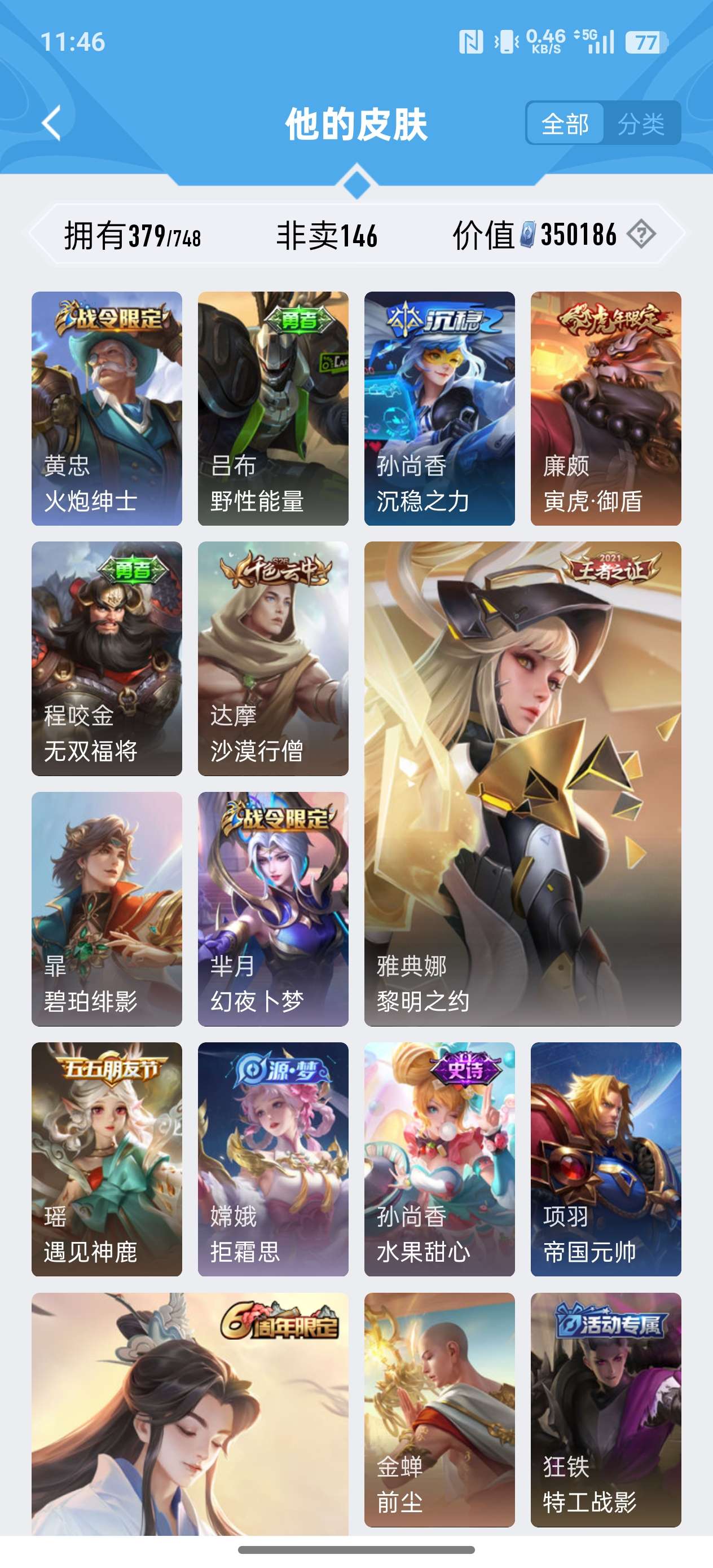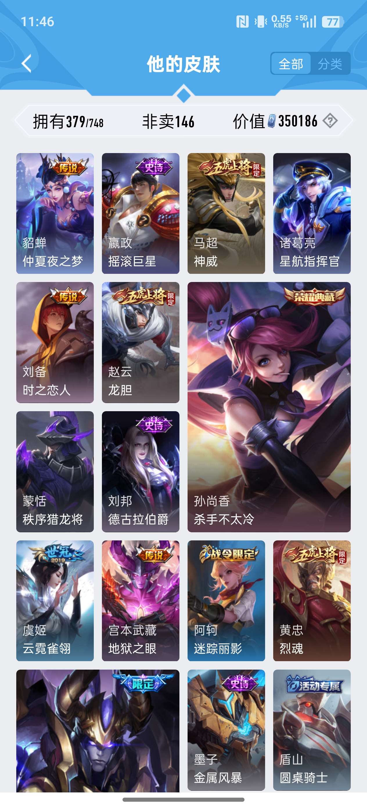 379皮肤 4典藏 34传说 4星传说(幽冥之眼 星际治安官 未来机甲 金色仲夏夜) 弑枪猎影 九霄