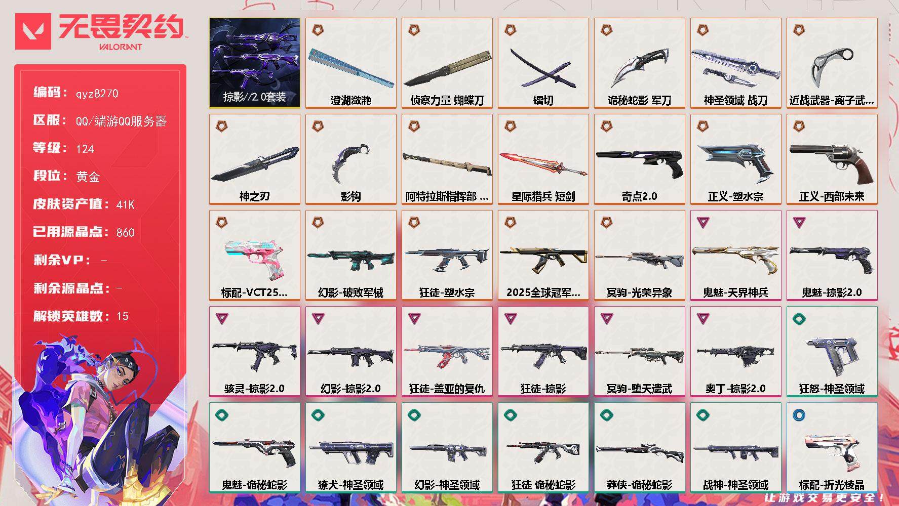 【qyz8270】25枪 掠影//2.0套 qyz8270 套装: 掠影2.0套装 近战武器皮肤: 澄湖潋滟,蝴蝶刀-侦察力量,镭切,神圣领域 战刀,离子武器2.0 爪刀,诡秘蛇影,神之刃,影钩 步枪皮肤: 狂徒-盖亚的复仇,幻影-破败军械,狂徒-塑水宗,狂徒-掠影,幻影-掠影2.0,2025全球冠军赛 狂徒 佩枪皮肤: 鬼魅-天界神兵,正义-塑水宗,鬼魅-奇点//2.0,标配-VCT25xBLG,正义-西部未来,鬼魅-掠影2.0 狙击枪皮肤: 冥驹-堕天遗武,冥驹-光荣异象 冲锋枪皮肤: 骇