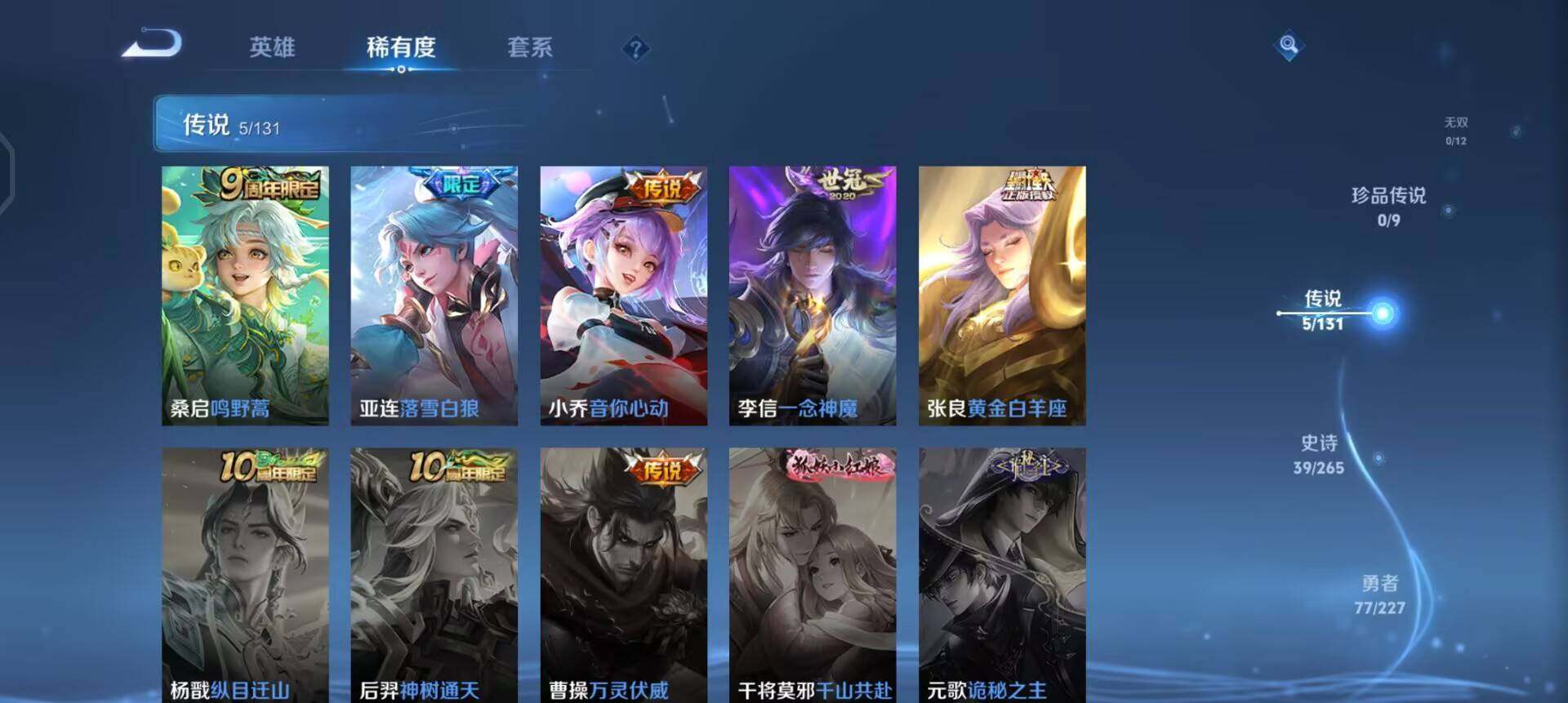 【传说皮肤】:桑启鸣野蒿,亚连落雪白狼,小乔音你心动,李信一念神魔,张良黄金白羊座