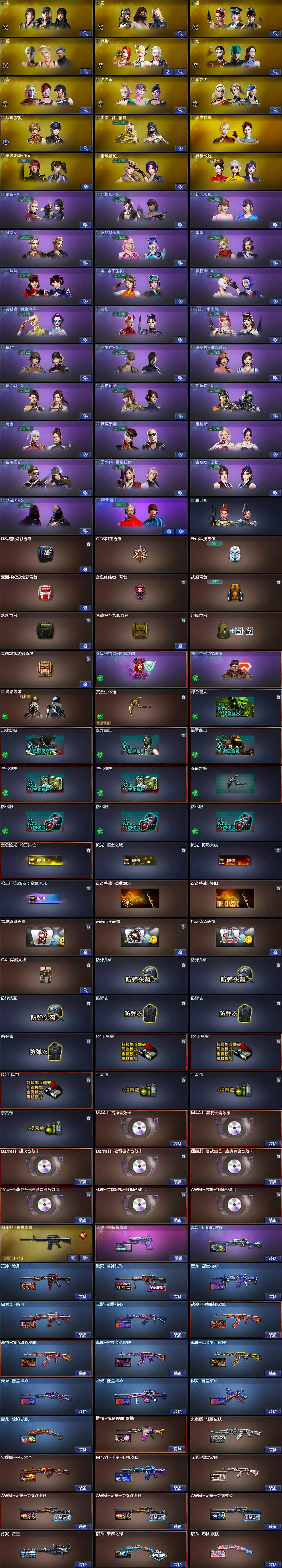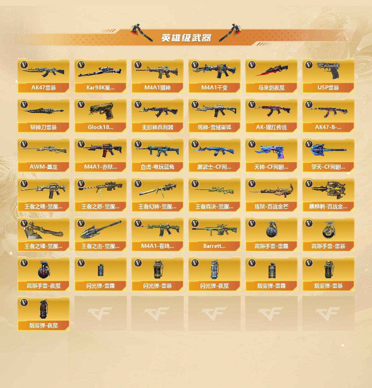 【热门武器】:传说辉光,QBZ03-金色蔷薇*2,Scar Light-白虎,HK417-朱雀,M4A1-青龙,死亡之眼,白虎-电玩蓝兔,Kar98K-星神,C.A.T,M4A1-黑骑士*6,汤姆逊-烈龙*7,RPK-盘龙*6,加特林-炼狱*2,斯泰尔-蝴蝶,USP-雷暴,沙鹰-修罗*7