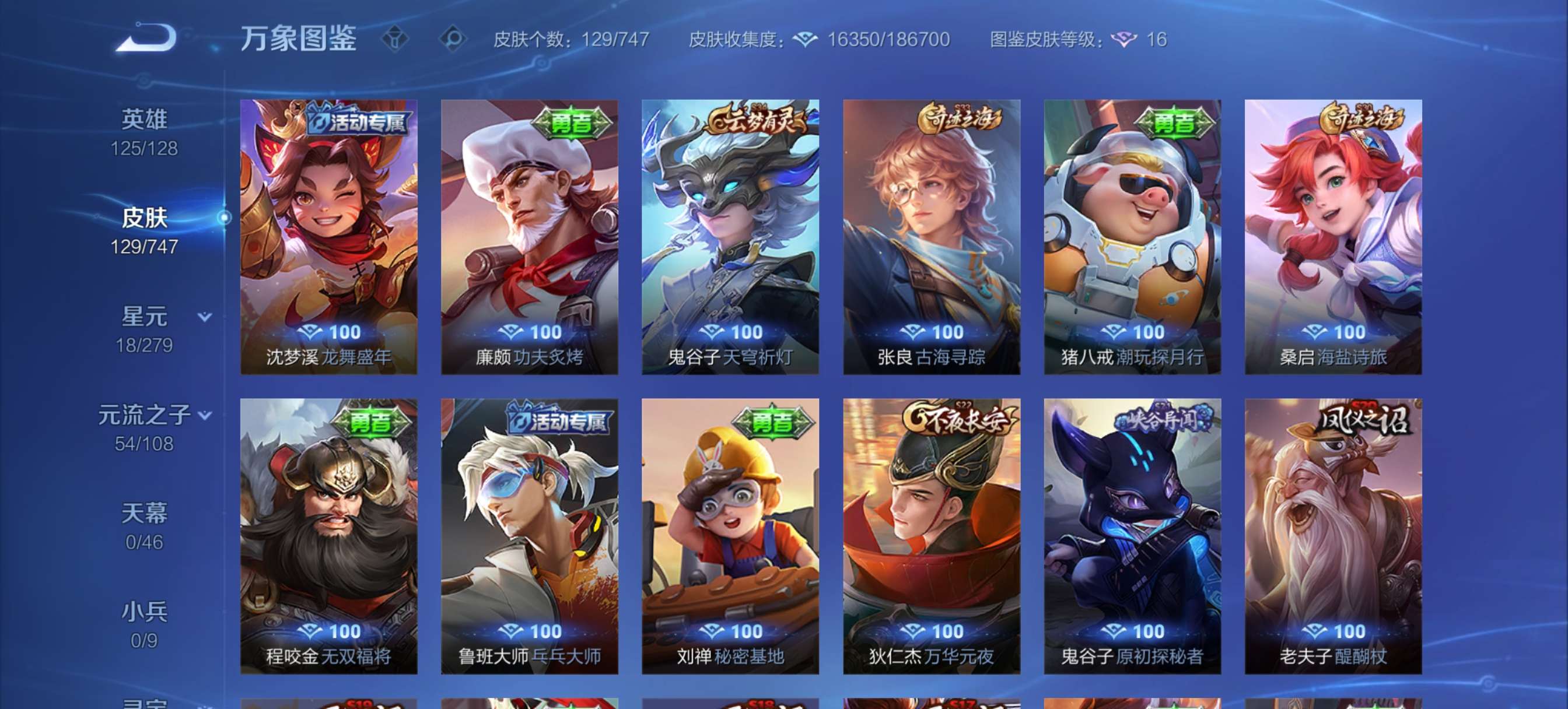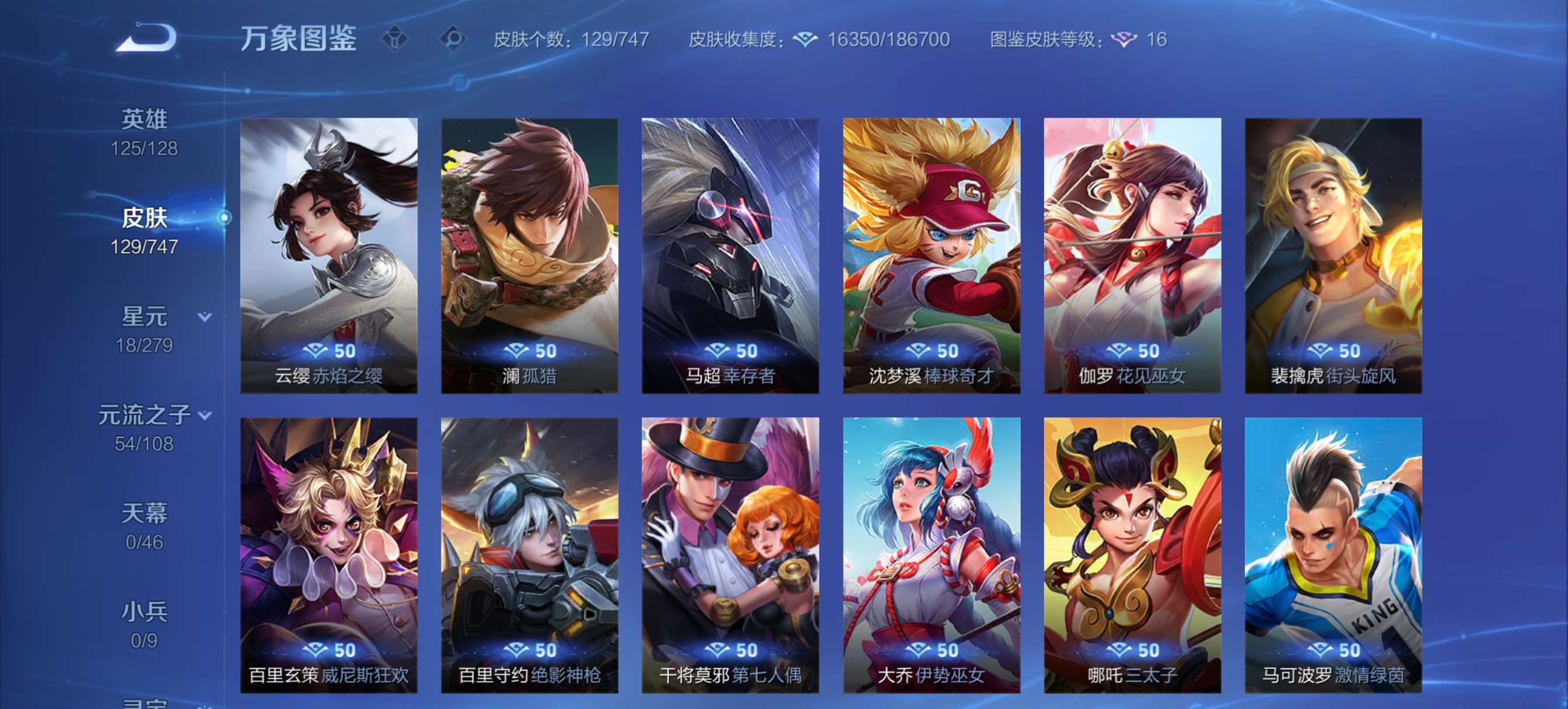 王者荣耀账号,皮肤129款,英雄129个,图鉴16级,账号干净没异常,安全放心。