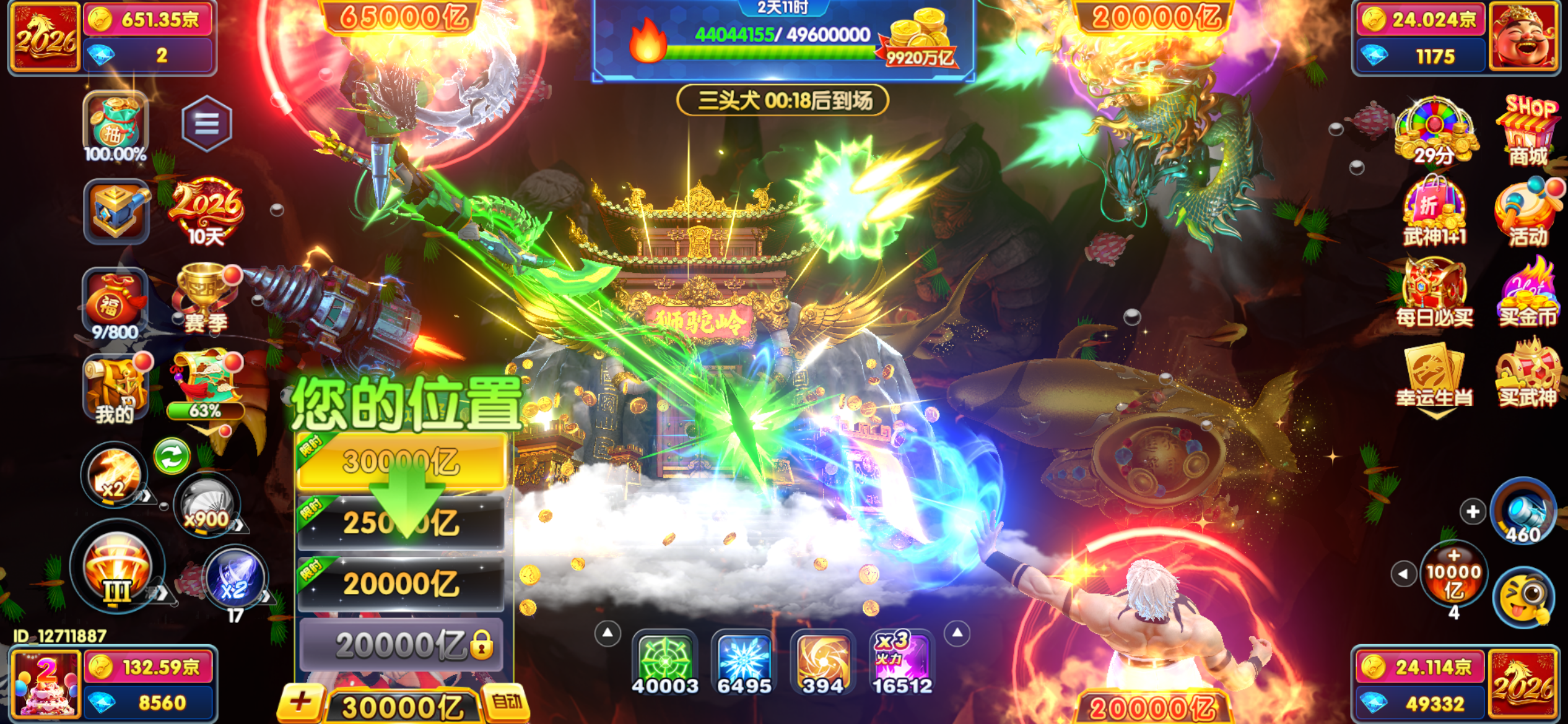 高爆发,神装,基础1.5万炮,金币加炮3万,
