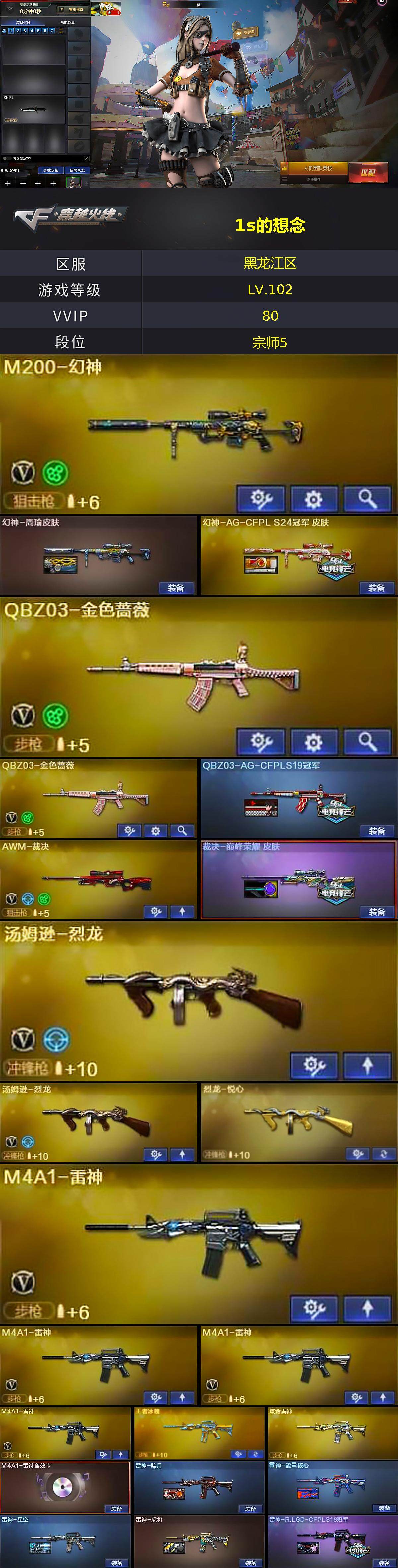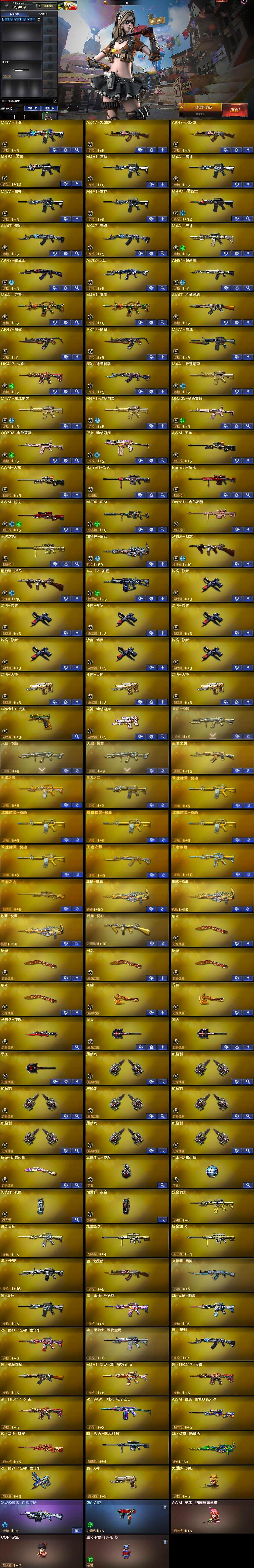 【热门武器】:QBZ03-金色蔷薇*2,HK417-朱雀,M200-幻神,死亡之眼,金色小号,M4A1-黑骑士,汤姆逊-烈龙*2,加特林-炼狱,沙鹰-修罗*7