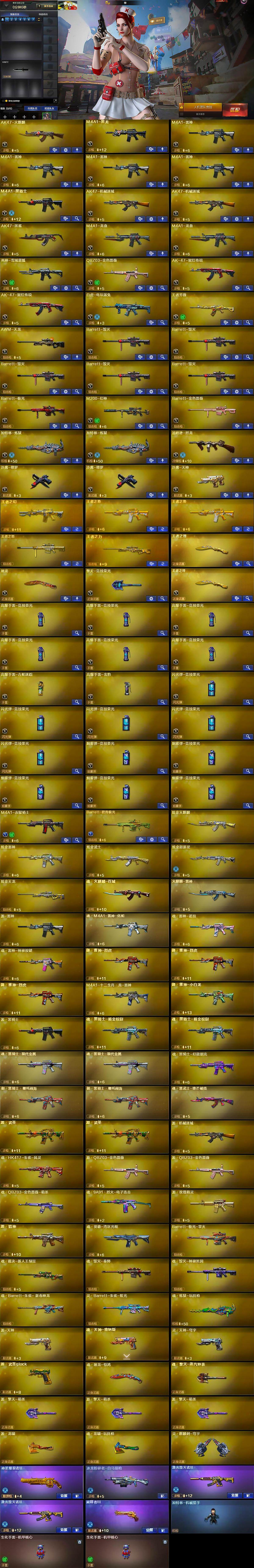 【热门武器】:QBZ03-金色蔷薇,M200-幻神,白虎-电玩蓝兔,M4A1-黑骑士,汤姆逊-烈龙,加特林-炼狱*2,沙鹰-修罗*2