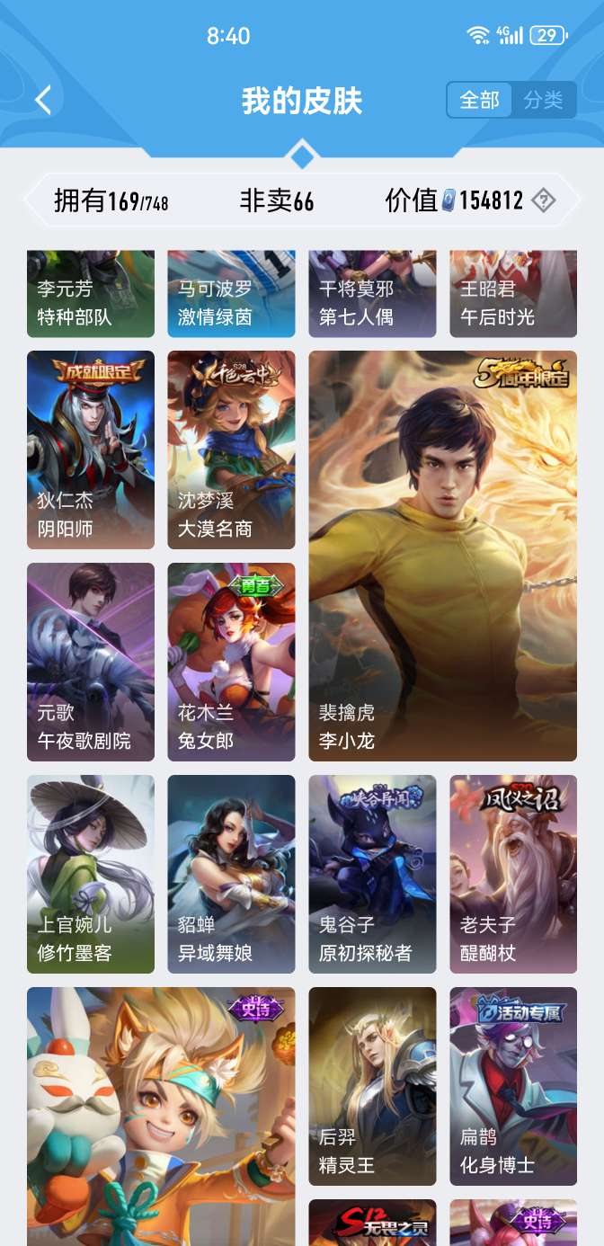 皮肤169 英雄128 绝世王者 荣耀典藏2 珍品传说1 传说16 其他皮肤56-非常的好,这个账号大家可以入手