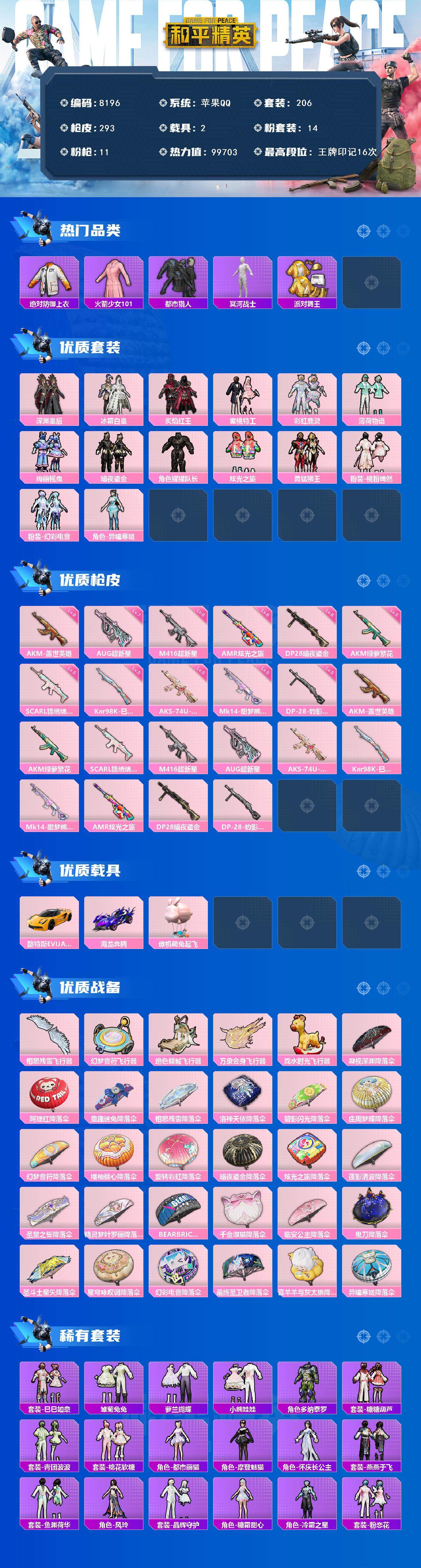 【8196】14粉装-11特效枪-2载具-7粉色飞行器-99573热力值-16王牌印记-206套装-293枪皮【热门品类】:绝对防御上衣,赤蝎幽灵,火箭少女101,都市猎人,冥河战士,派对舞王【粉色枪皮等级】:九级AKM-盖世英雄