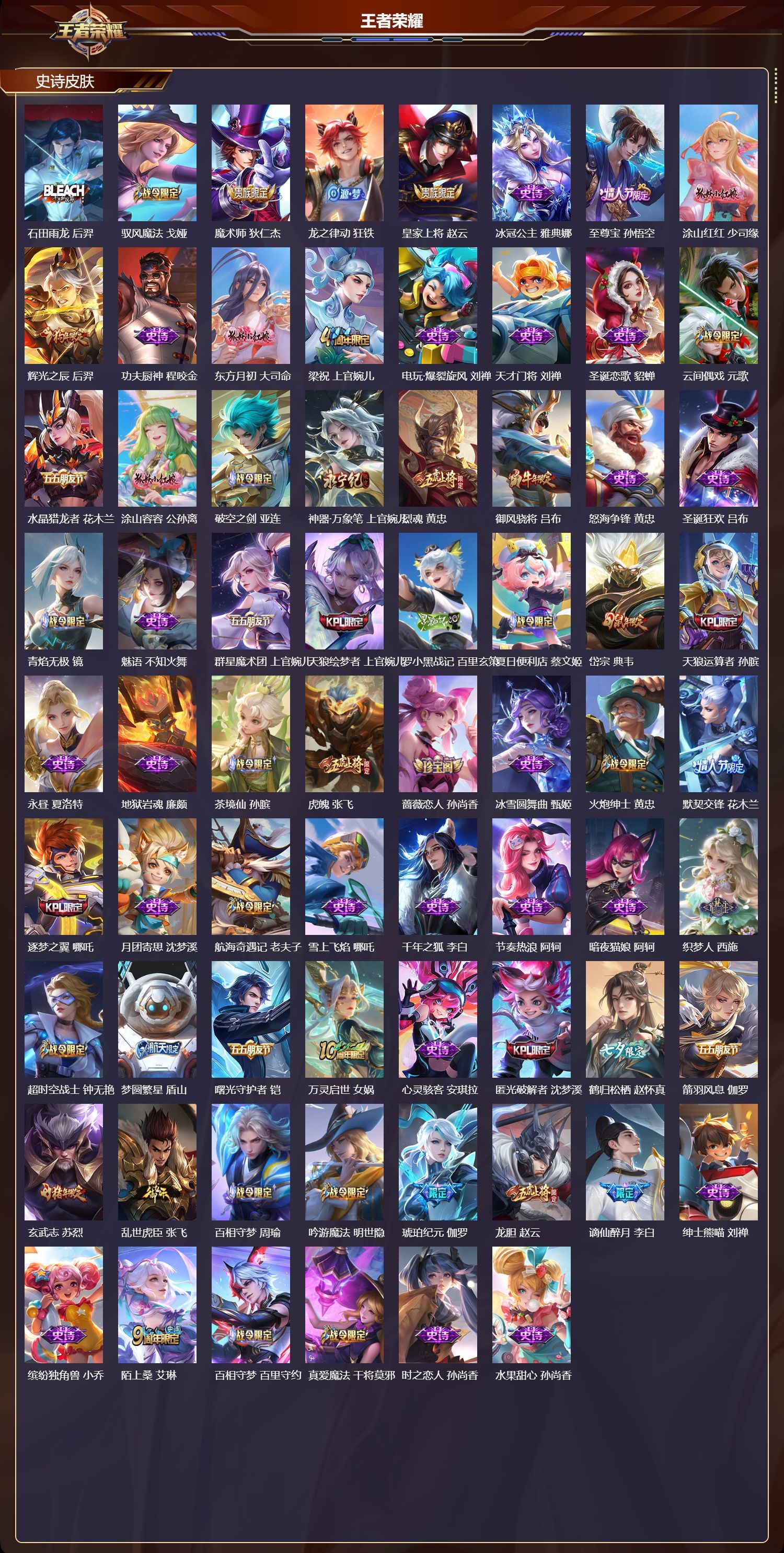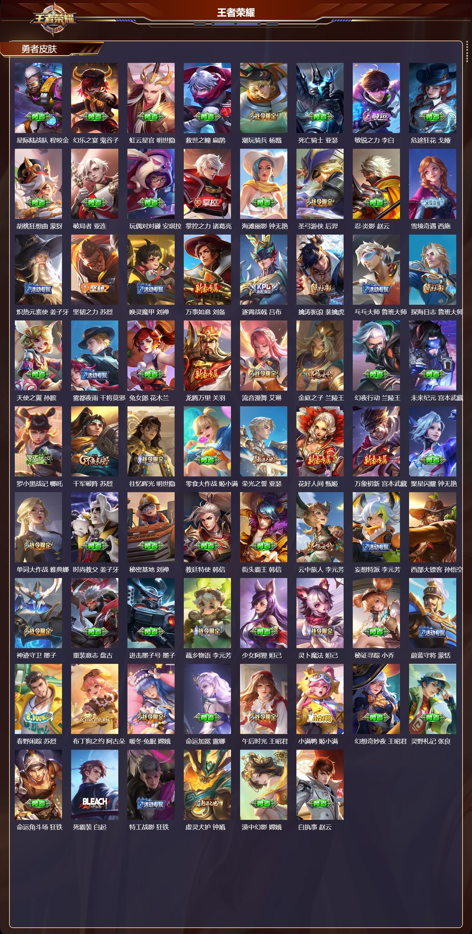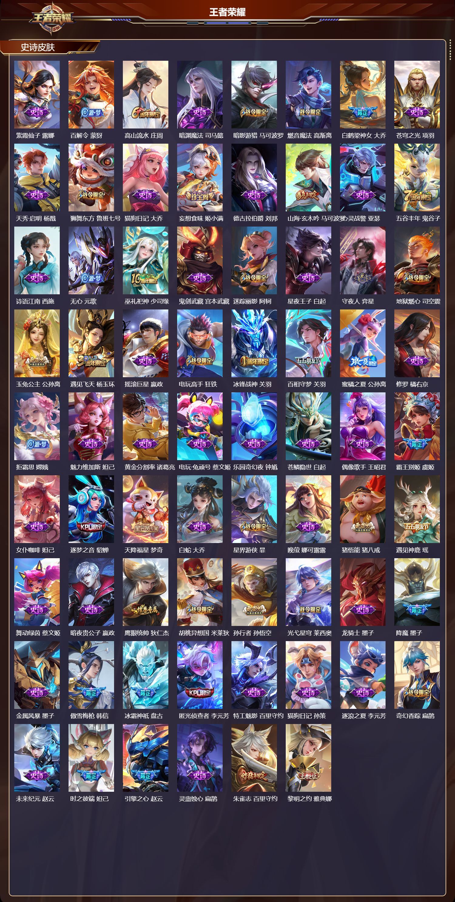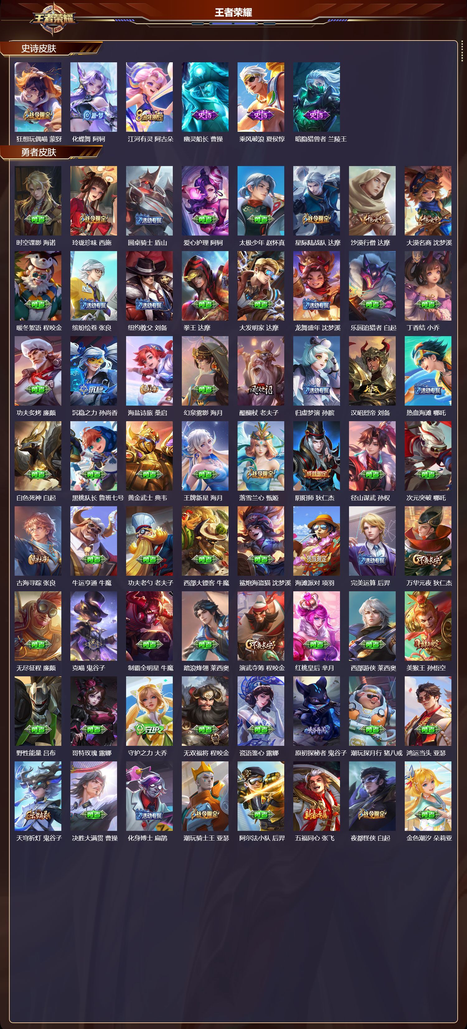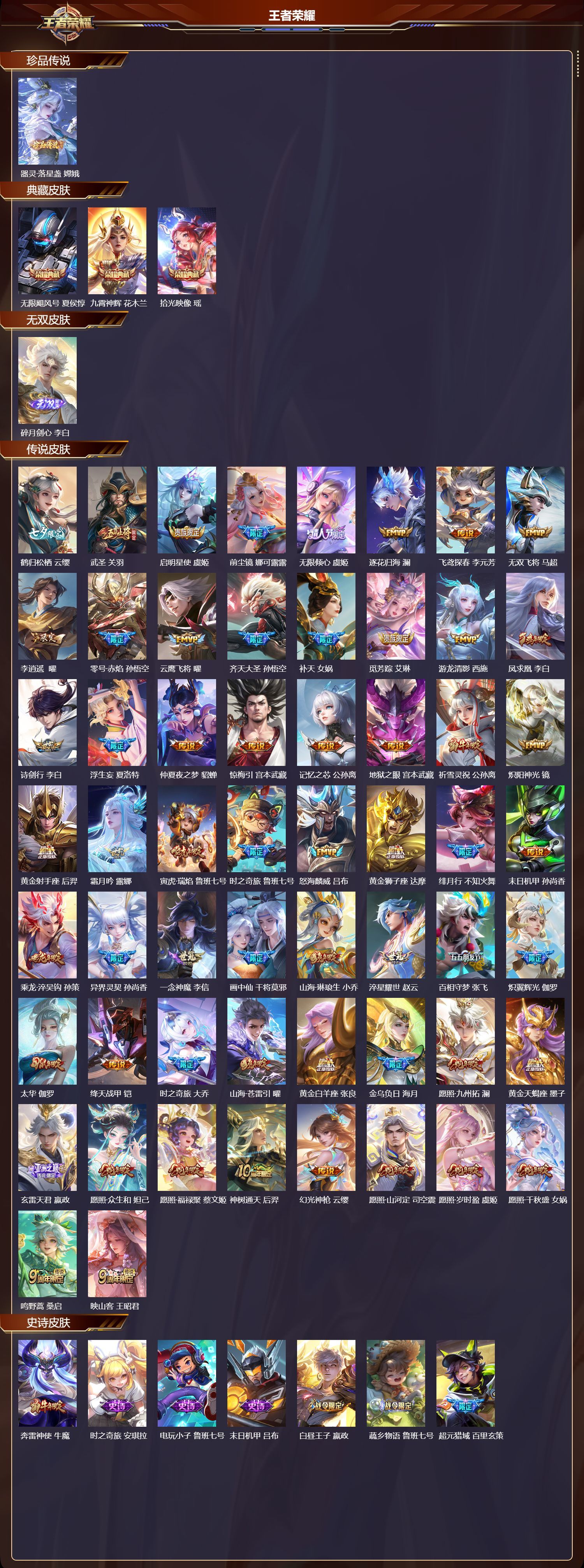 安卓QQ/传奇王者/460皮肤/127英雄/3典藏/0珍品无双/1无双/1珍品传说/58传说/153