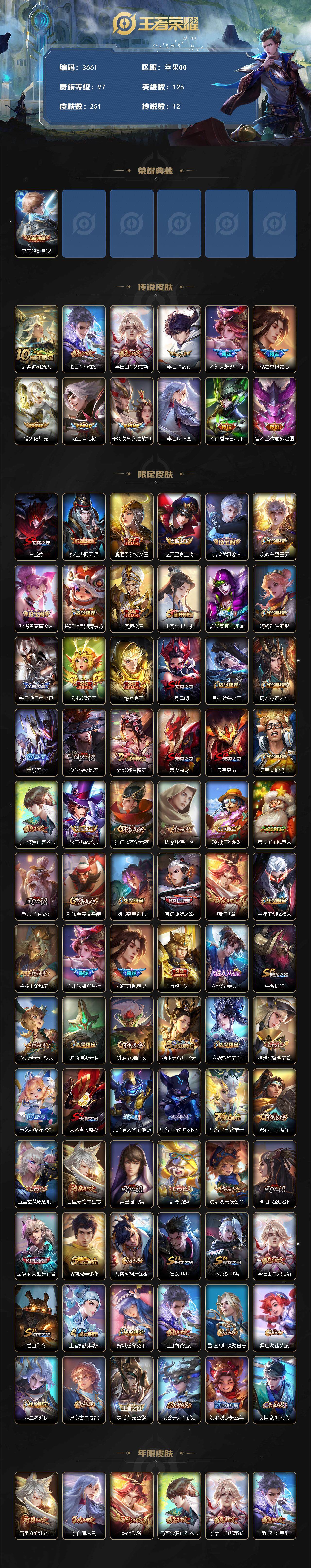 苹果Q-V7-最强王者段位-126英雄-251皮肤-1典藏皮肤-12传说-66史诗