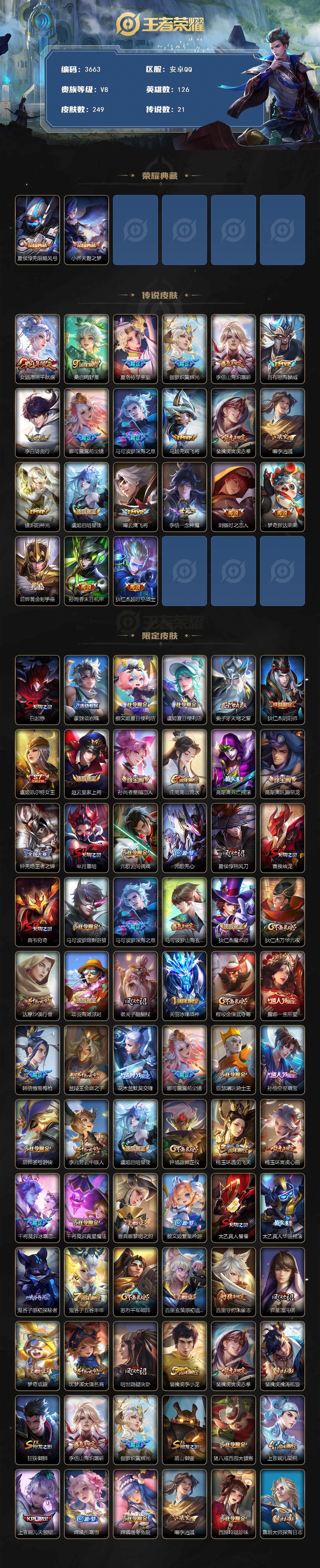 安卓Q-V8-最强王者段位-126英雄-249皮肤-2典藏皮肤-21传说-74史诗