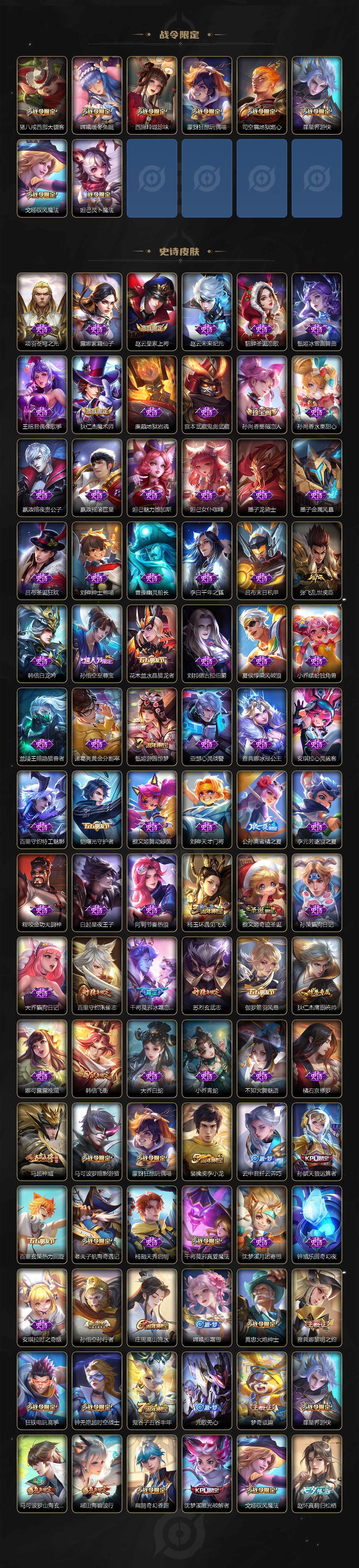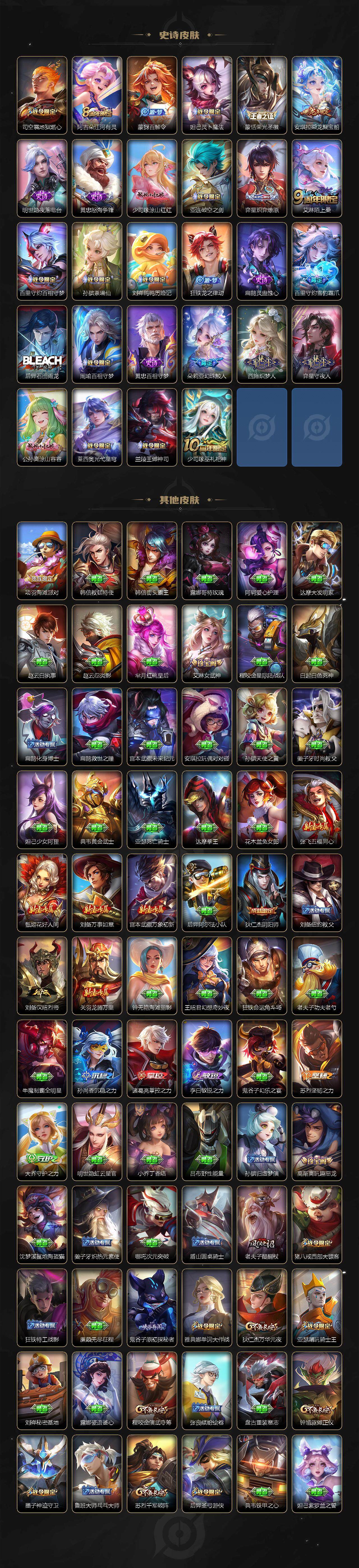 【英雄全皮】:孙权全皮,朵莉亚全皮,鬼谷子全皮,苏烈全皮,蒙恬全皮,司空震全皮,影全皮,少司缘全皮