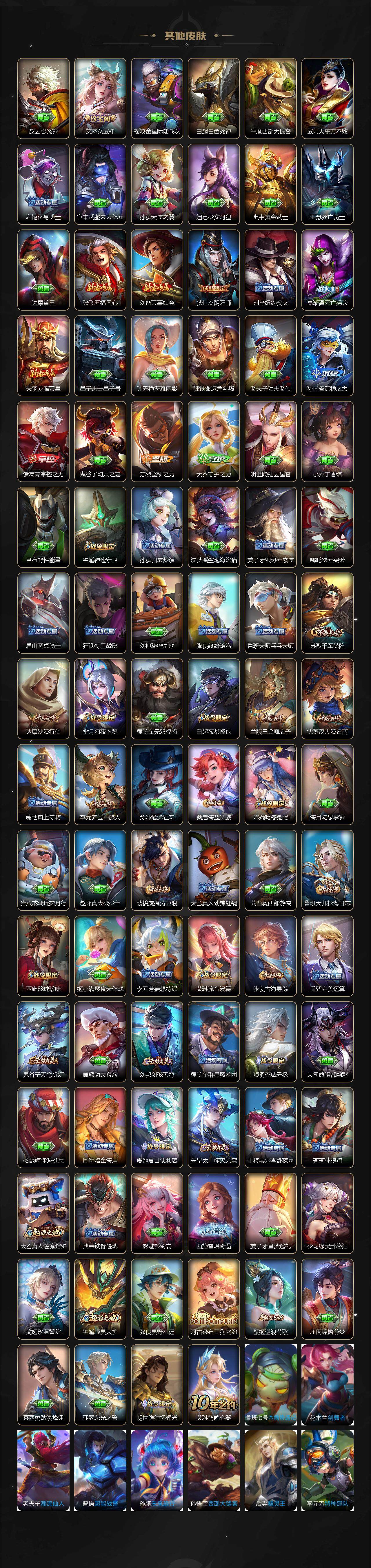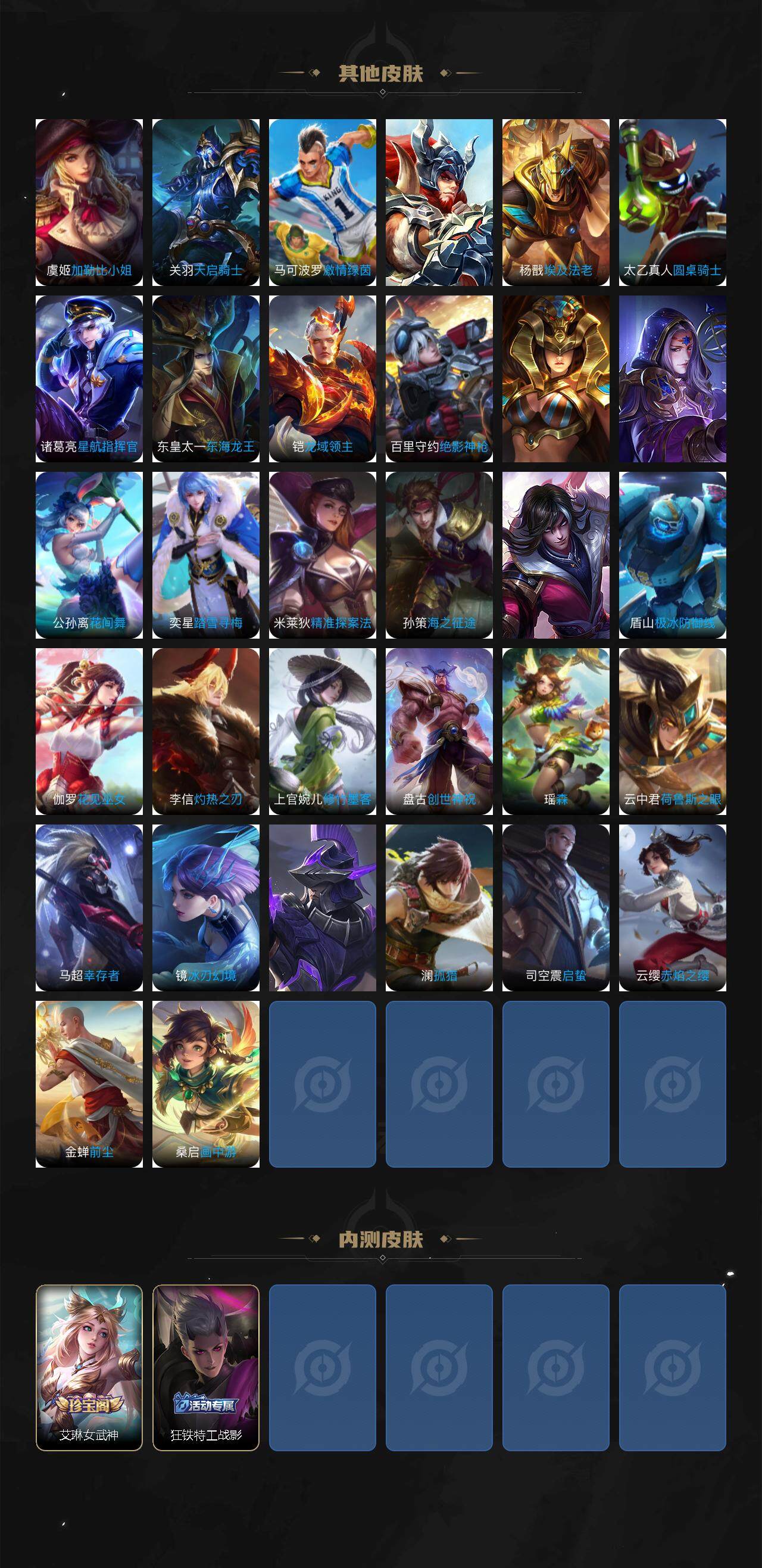 【传说皮肤】:后羿神树通天,桑启鸣野蒿,公孙离记忆之芯,李白诗剑行,马超无双飞将,铠绛天战甲,镜炽阳神光,虞姬启明星使,曜云鹰飞将,李信一念神魔,刘备时之恋人,后羿黄金