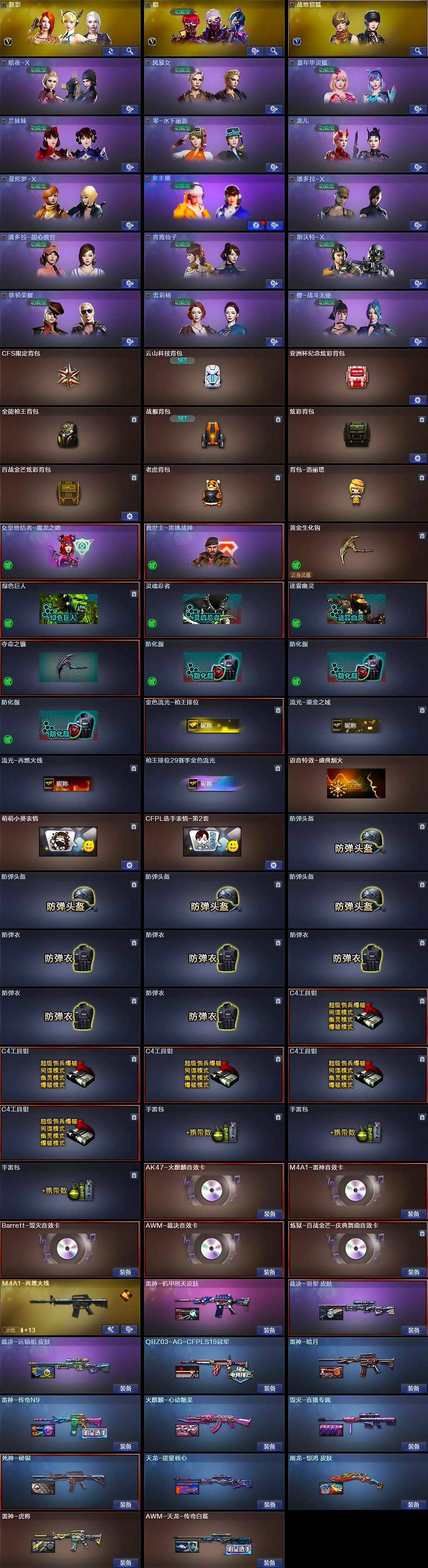 【音效卡】:AK47-火麒麟音效卡,M4A1-雷神音效卡,Barrett-毁灭音效卡,AWM-裁决音效卡,炼狱-百战