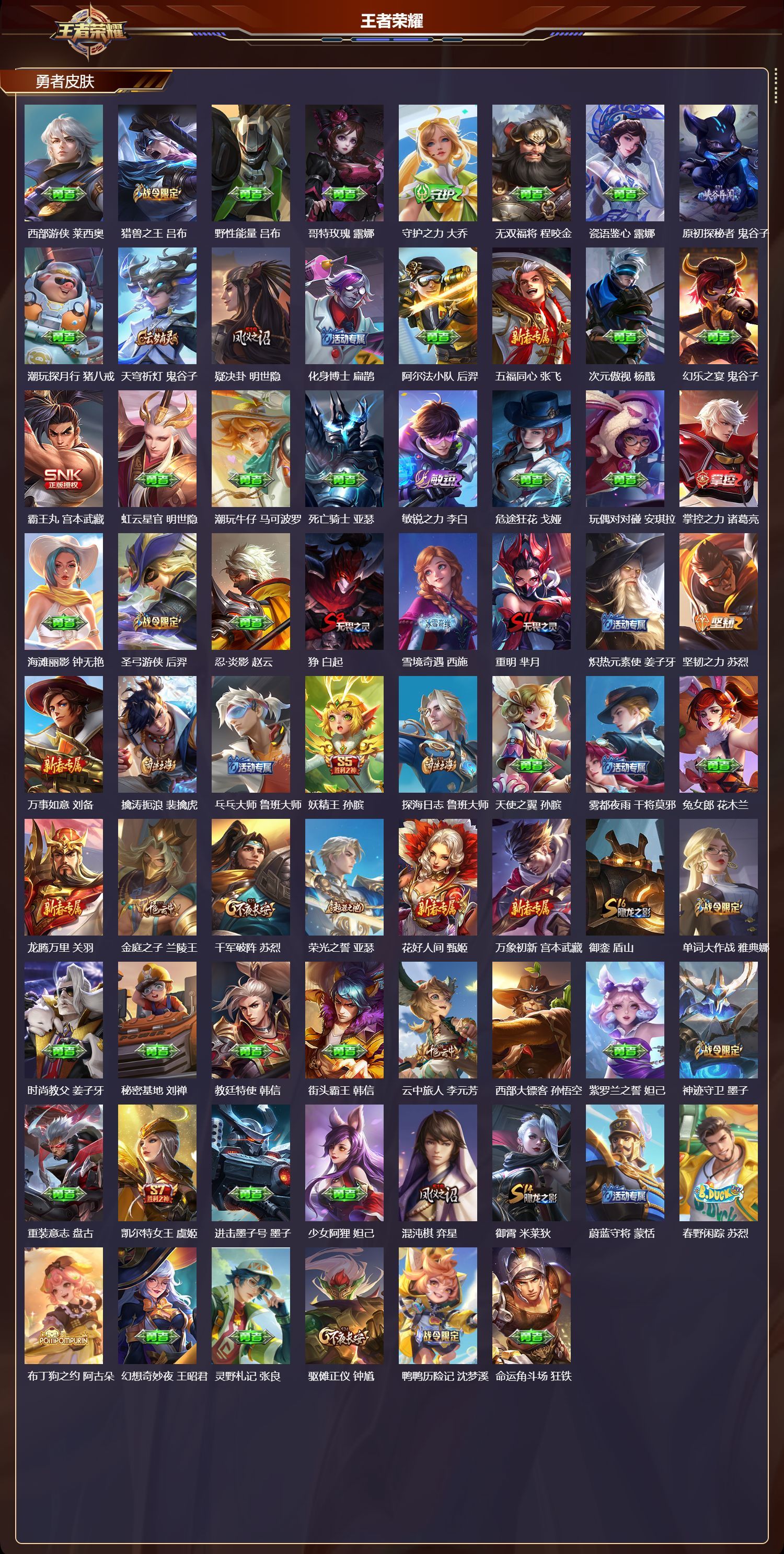 安卓QQ/传奇王者/283皮肤/127英雄/3典藏/0珍品无双/0无双/1珍品传说/32传说/71史