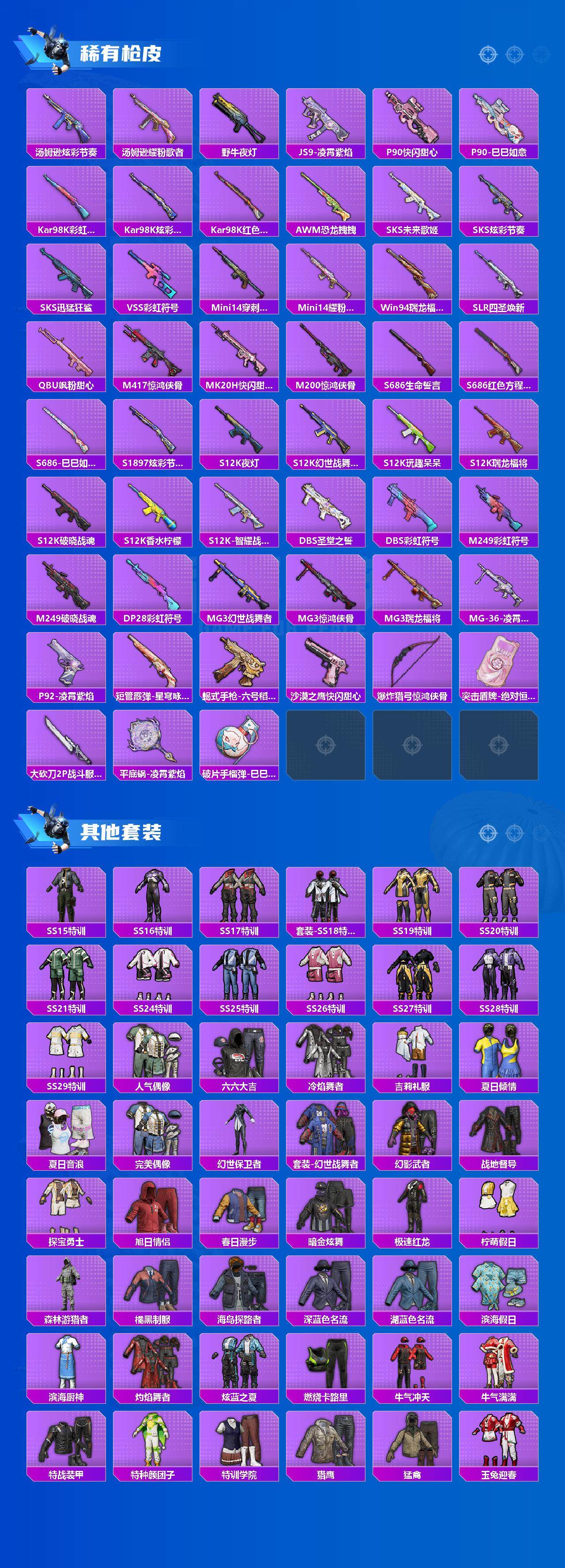 【粉色枪皮等级】:AKM-绿萝繁花(五级),M416-电玩时刻(五级),GROZA-镜光银凌(五级),Kar98K-巳巳如意(五级),DP-28-豹影疾电(五级)