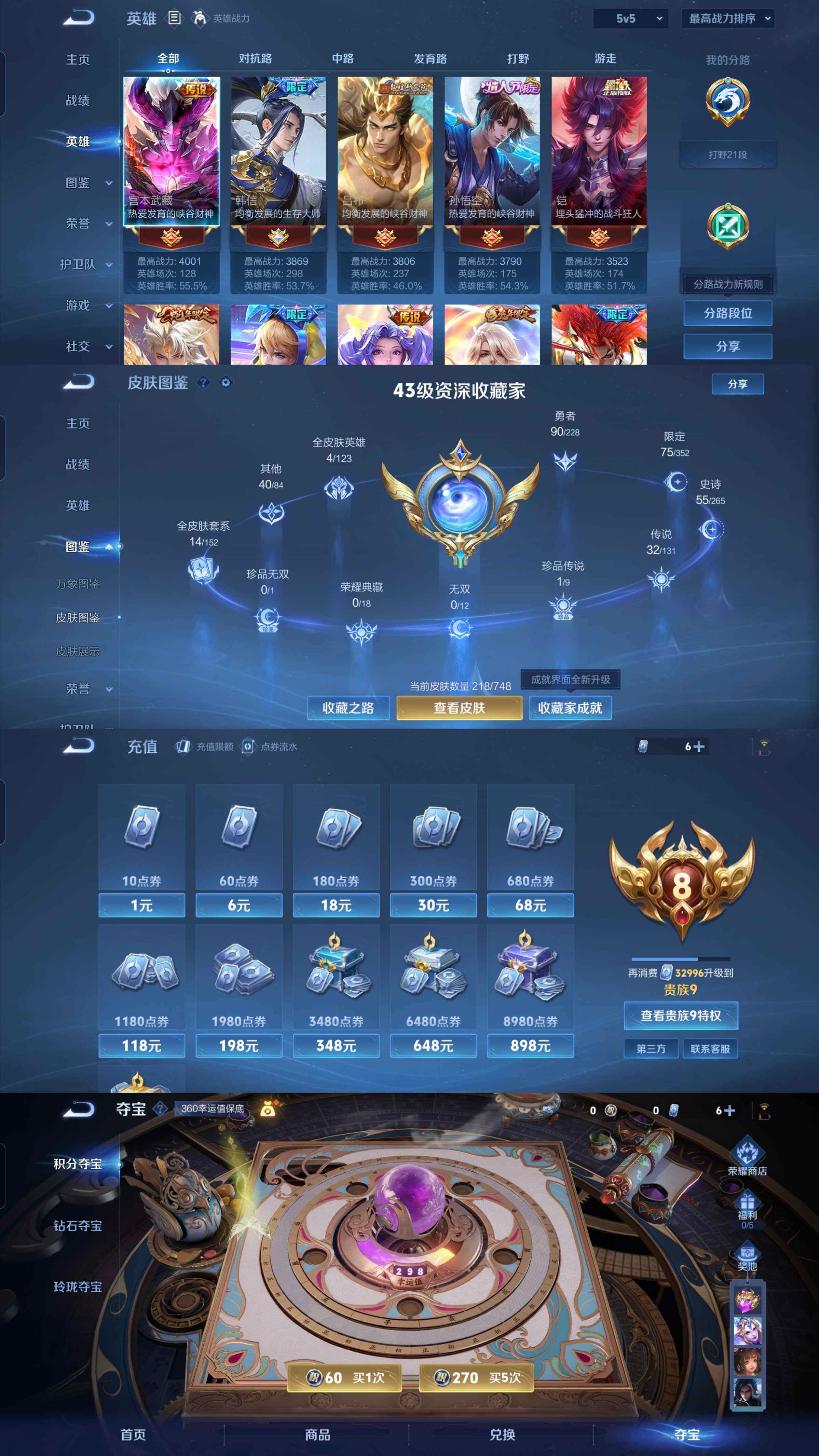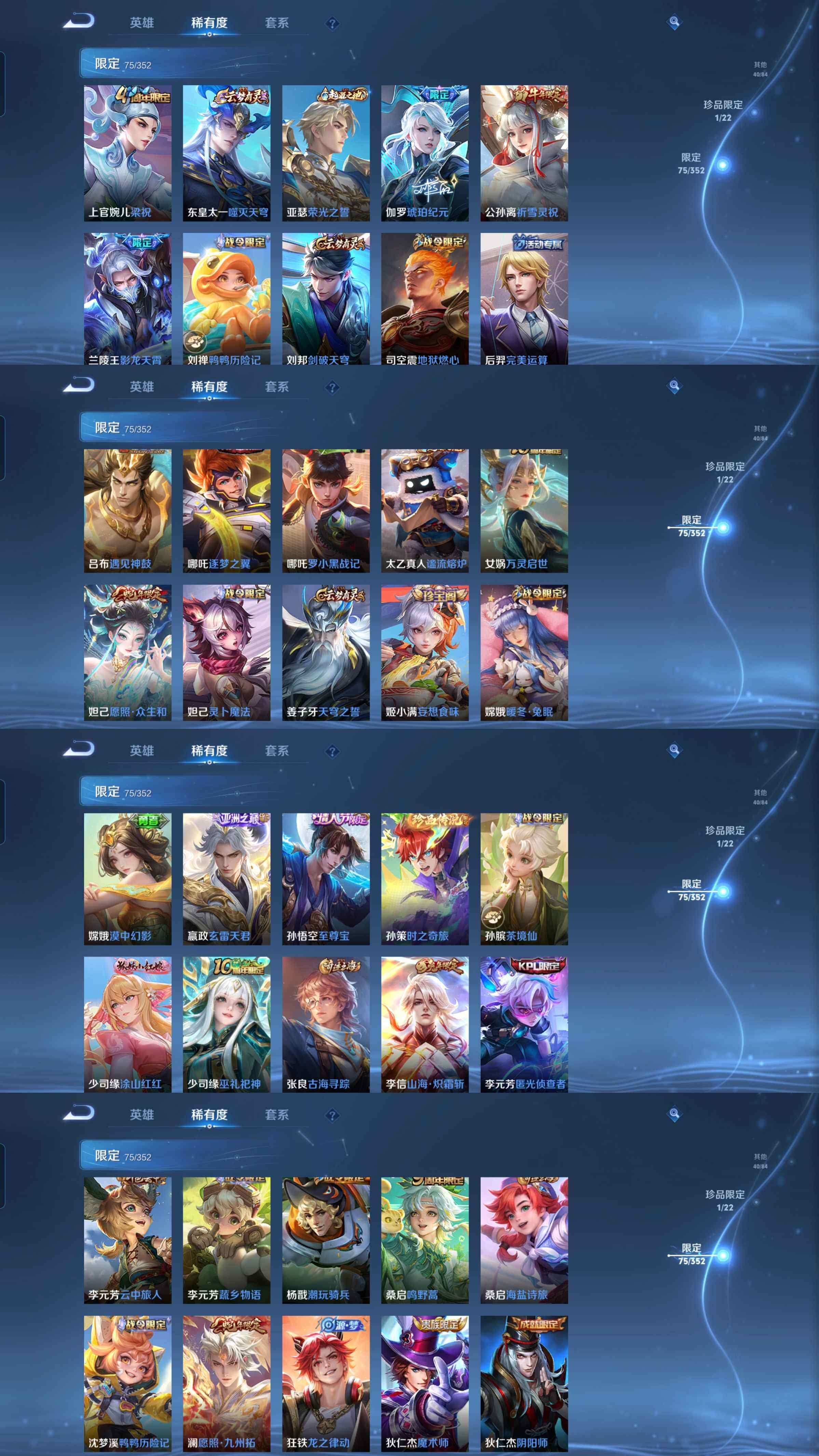皮肤218 英雄127 荣耀王者 传说32 其他皮肤63-x88,1珍品传说时之奇旅33传说1星传说至尊宝允诺千山炫雷天君琥珀纪元仲夏夜