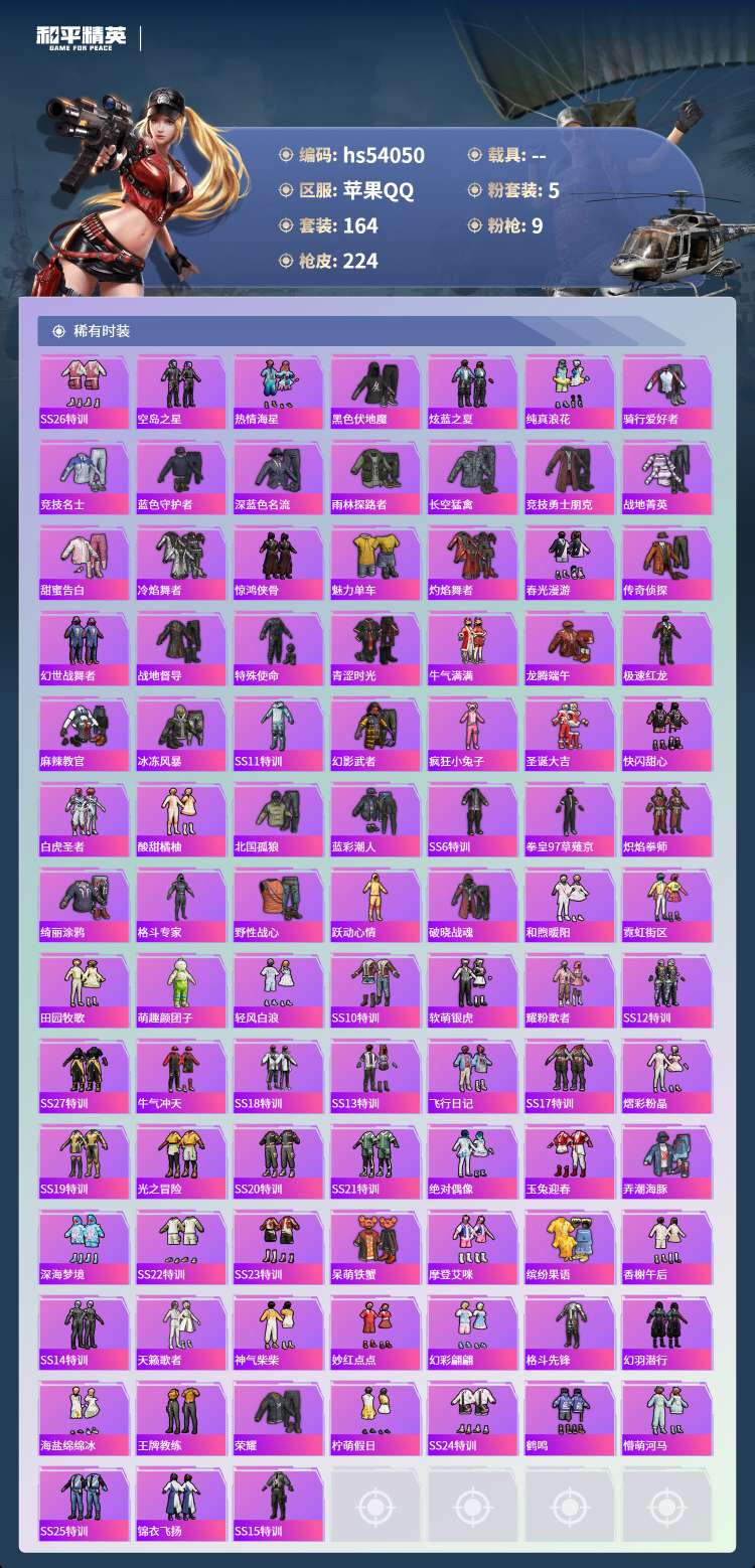 hs54050 苹果手Q-22王牌印记-有战神框-5粉装-9特效枪-73910热力值-164套装-2