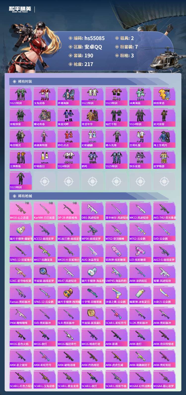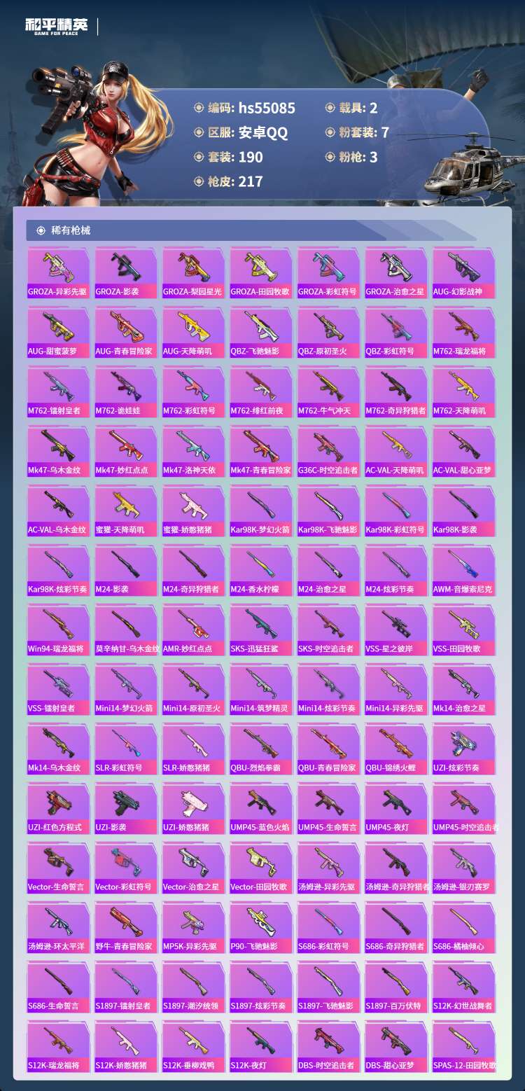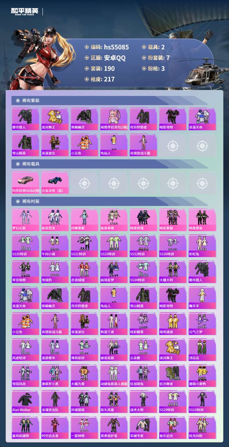 hs55085 安卓手Q-16王牌印记-7粉装-3特效枪-2载具-71065热力值-190套装-21