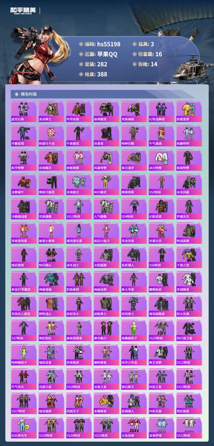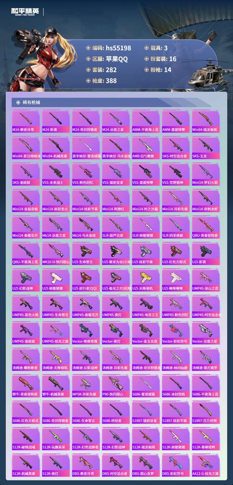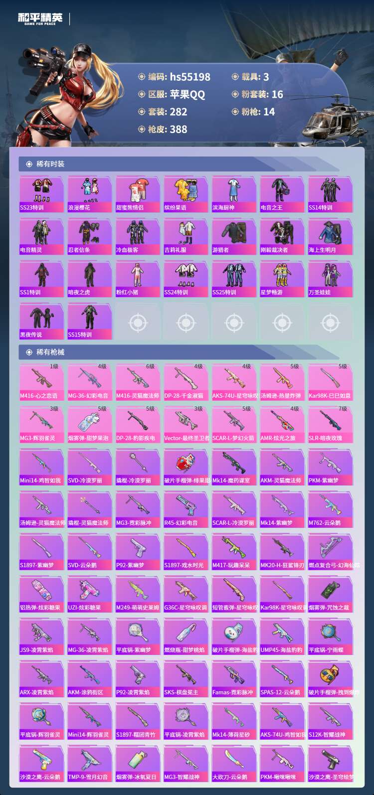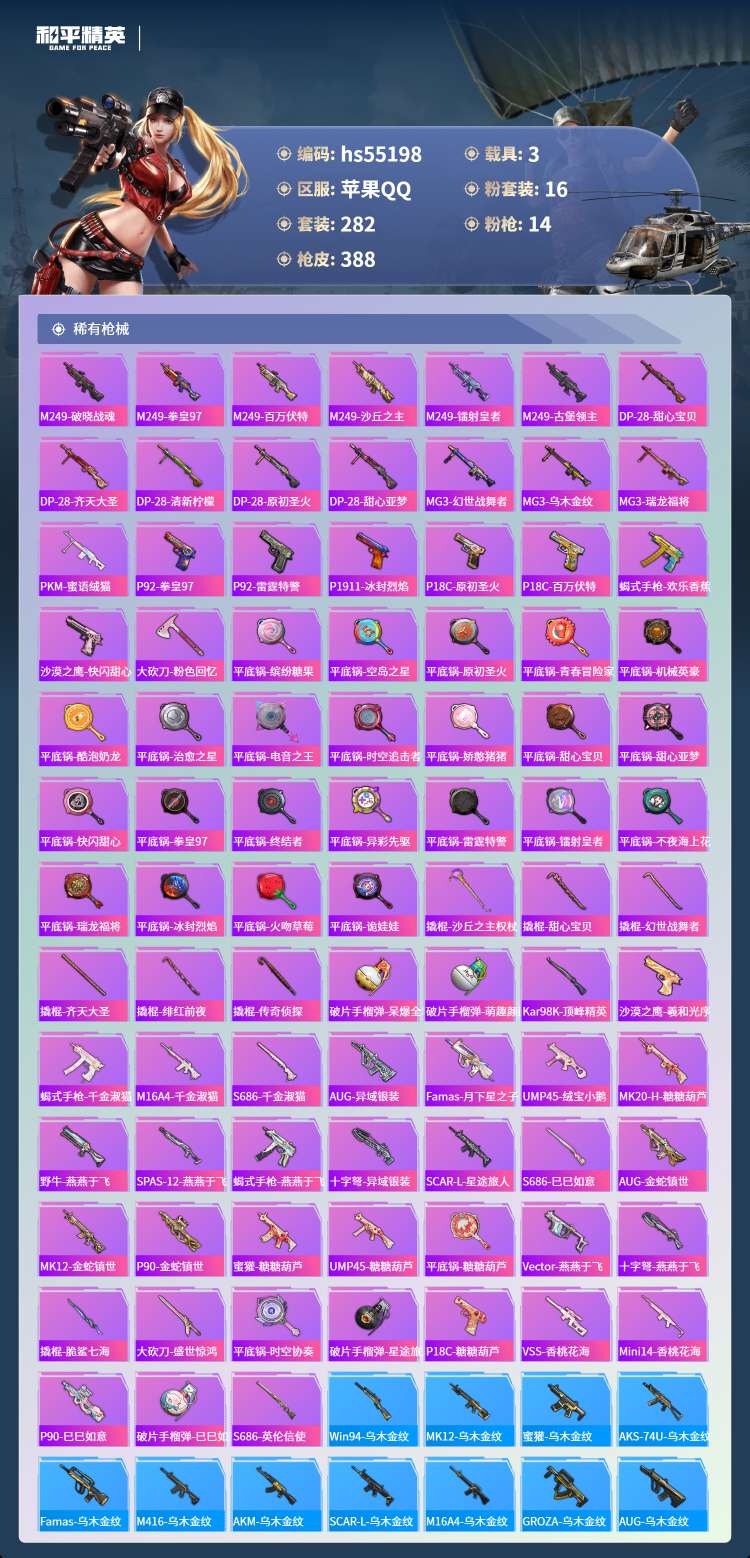 hs55198 苹果手Q-11王牌印记-16粉装-14特效枪-3载具-136304热力值-282套装