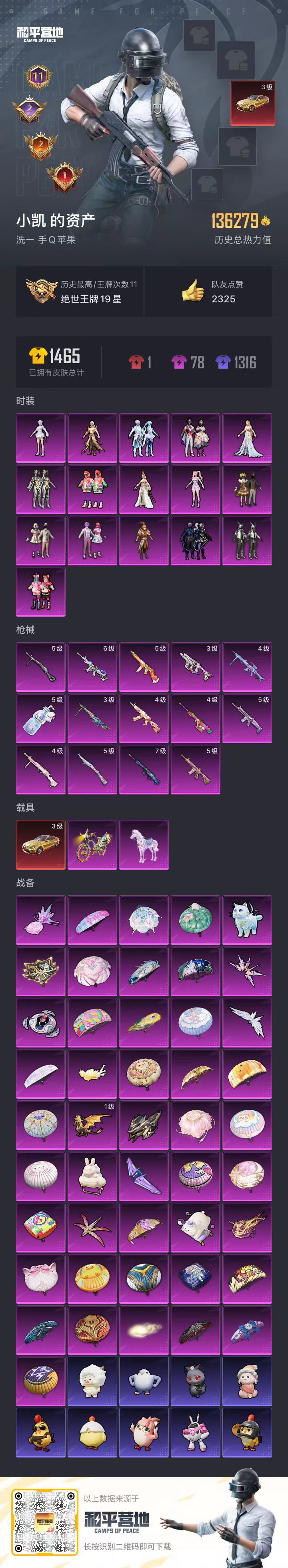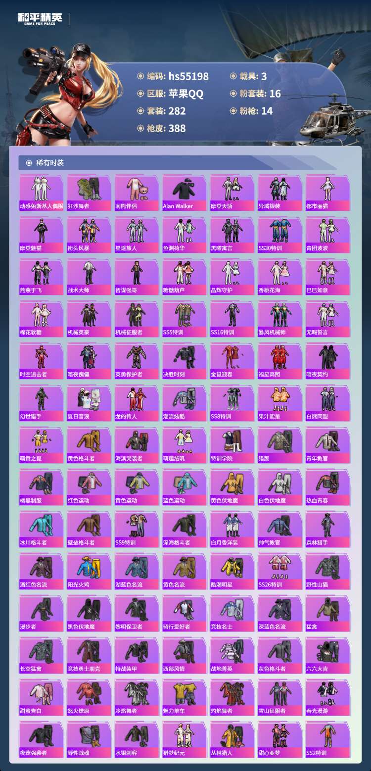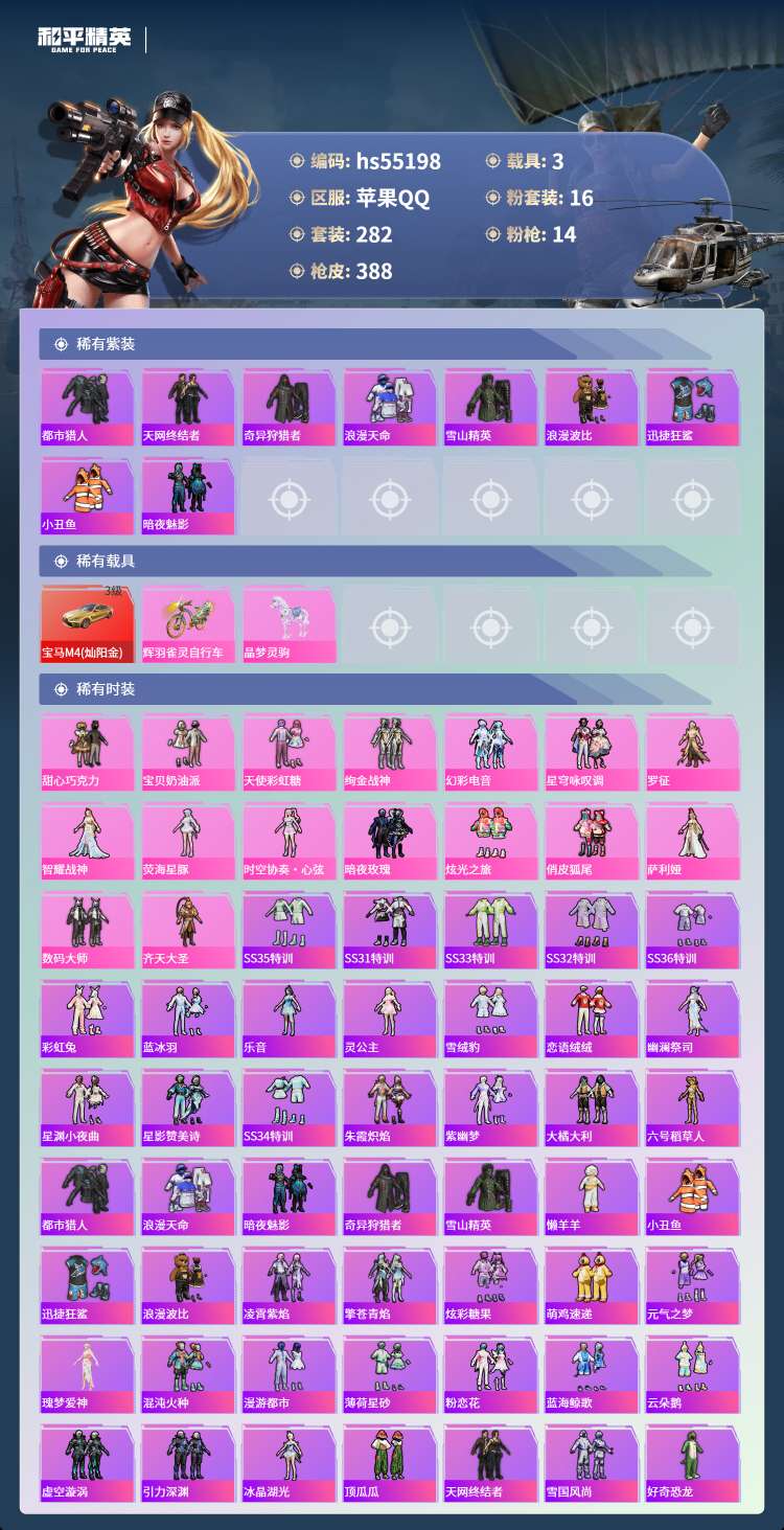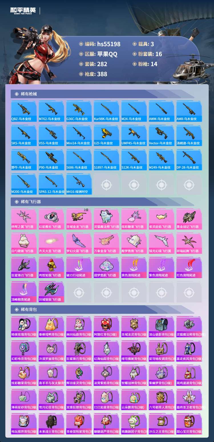hs55198 苹果手Q-11王牌印记-16粉装-14特效枪-3载具-136304热力值-282套装