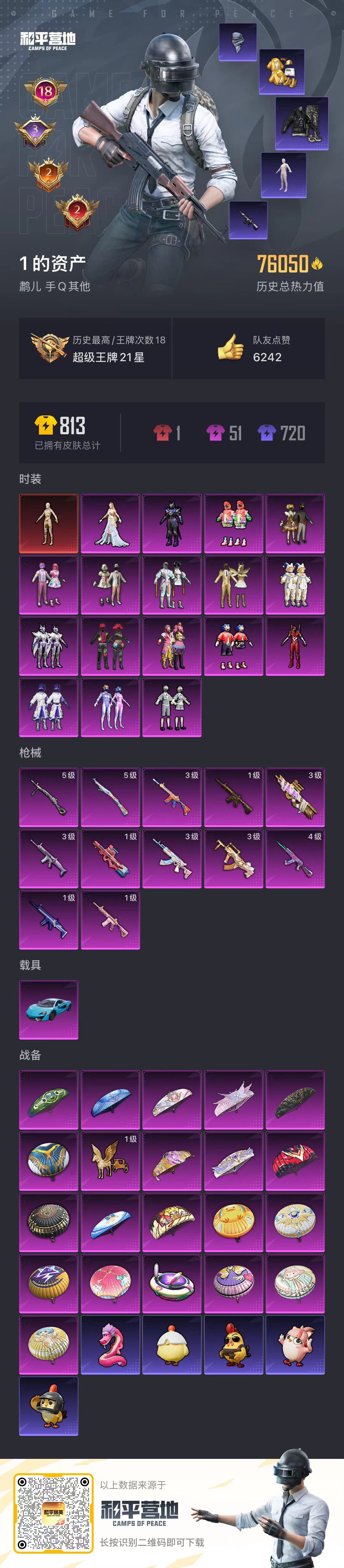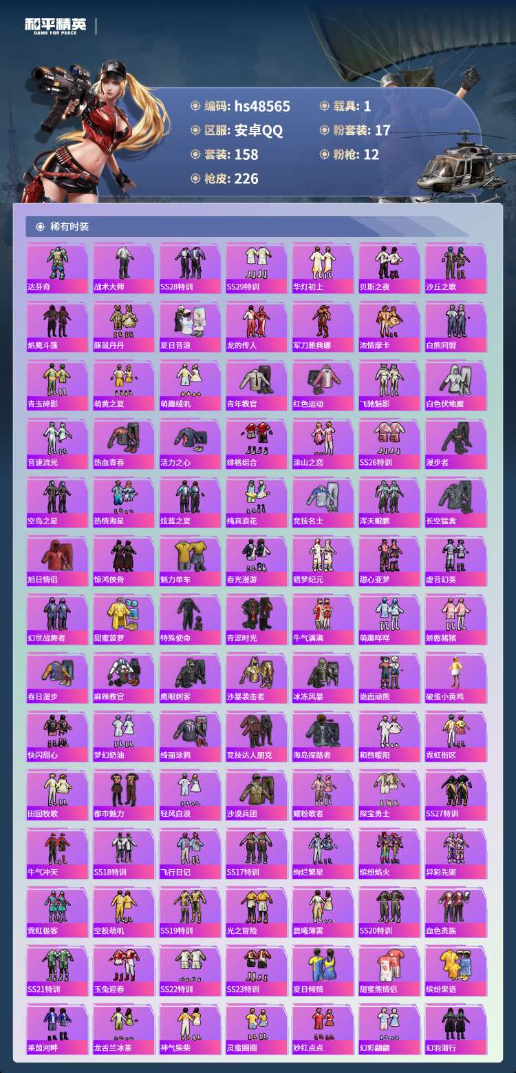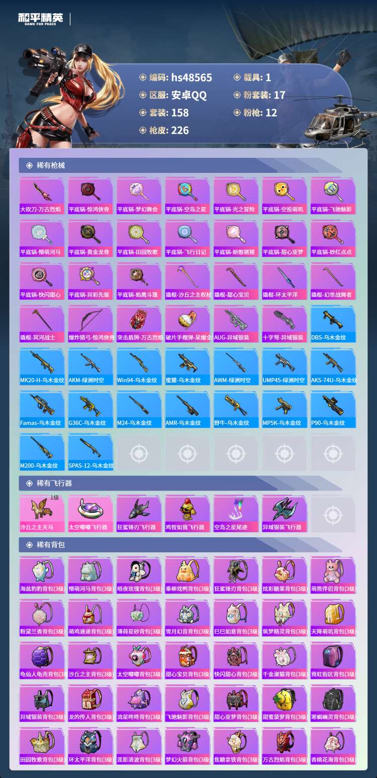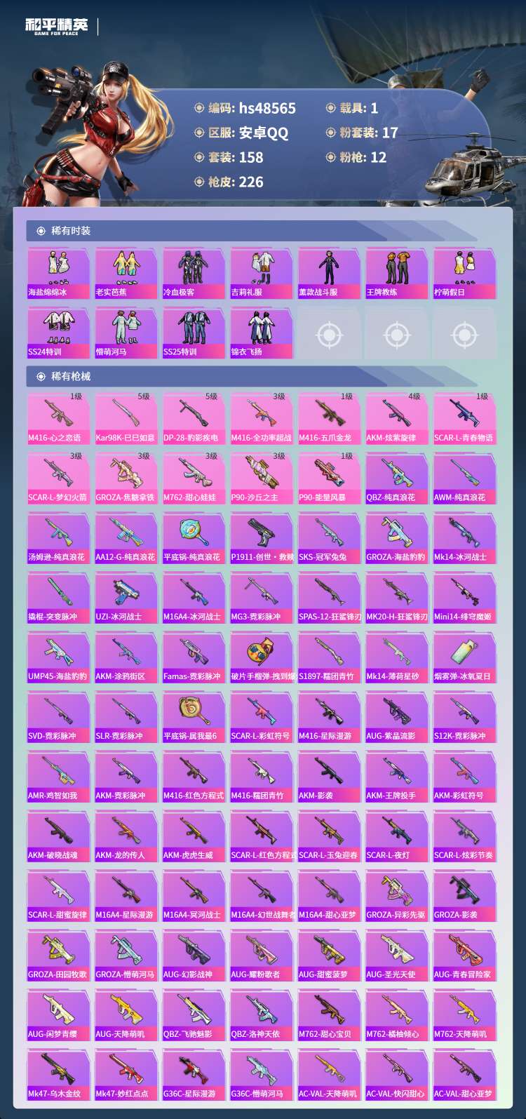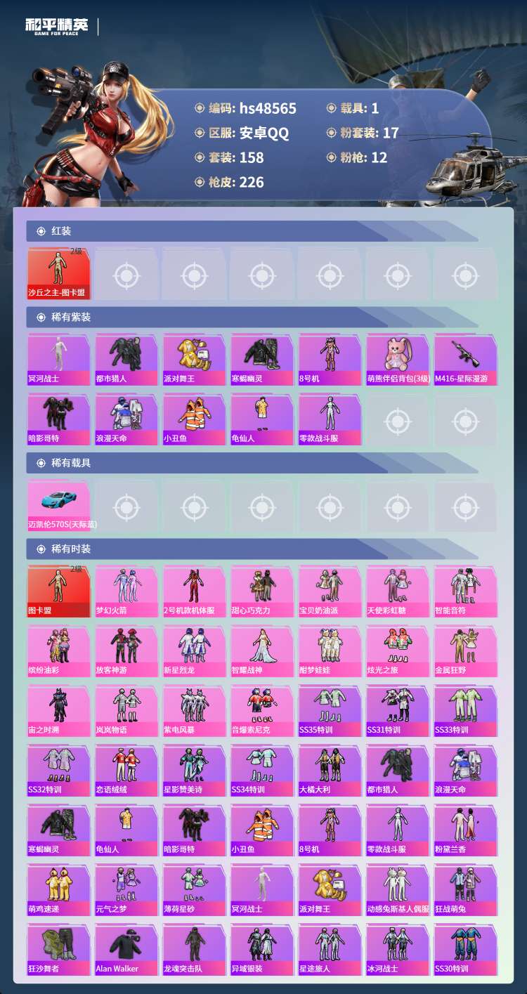 hs48565 安卓手Q-18王牌印记-1红装-17粉装-12特效枪-1载具-76050热力值-15